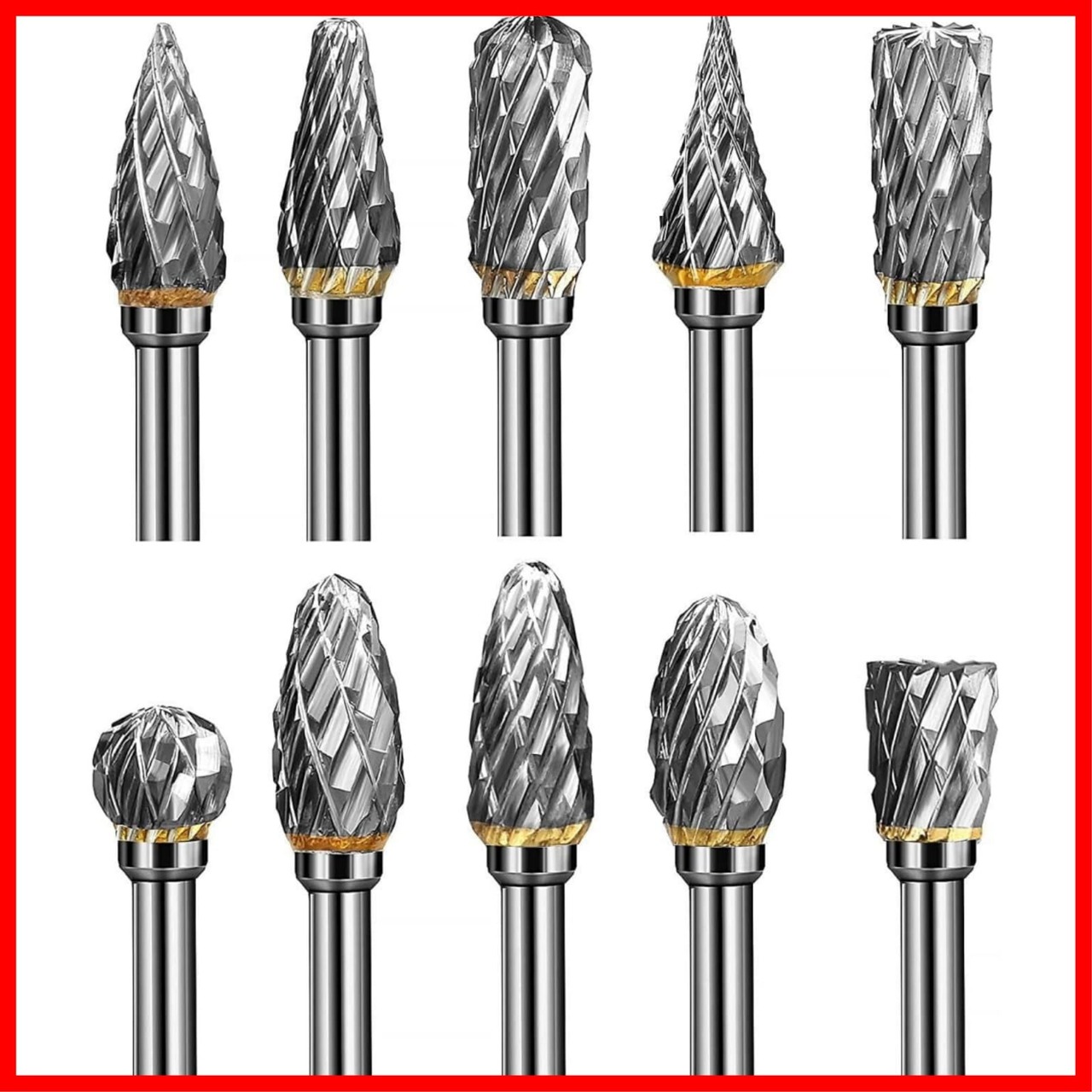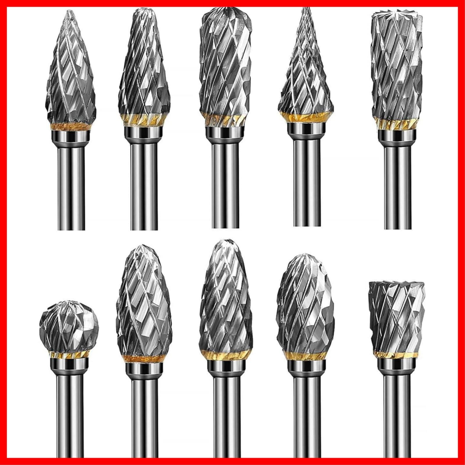 【10本セットタングステン製 リューター ビット】さまざまな形状のバリが10個あり、多目的に使用できます。 ボール、コーン、シリンダー、ニードルポイント、テーパーなど、ほとんどの穴あけニーズを満たします。 鋳鉄、鋳鋼、炭素鋼、合金鋼、ステンレス鋼、銅、アルミニウム、大理石、翡翠、骨などを切断できます。