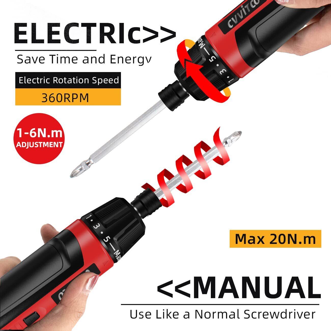 【トルク調整機能】優れた性能のモーター, 金属製ギアボックス。市販のミニ電動ドライバーと比較して、トルクが2〜3倍になります。 機械的調整ノブ、電気モードのトルクは1N.m-6N.mから正確に調整できます。電気トルクが大きいほど、ネジを深くねじ込むことができます。最大ボルト直径は5mm、手動モデルトルク最大20N.m。