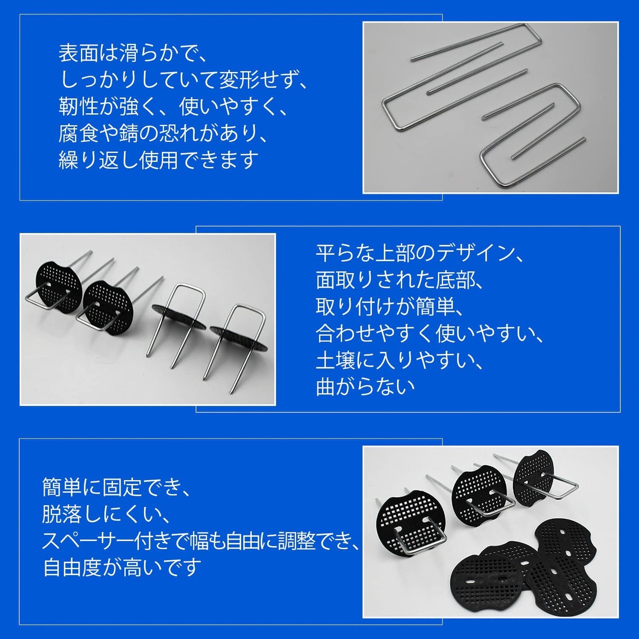 【広く用途】弊社の販売したUピンは地面シートの固定と脱落の問題を解決するためのものです。防草シート、人工芝、農業用防虫ネット、不織布、ビニールマルチ、各種シート・マット等を地面に設置・固定できるU字型ピンの商品です。園芸・農業・庭用だけでなく、キャンプの時にテントの固定ピンとして最適です。