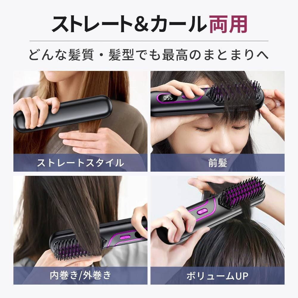 カールもストレートも対応!持ち運びも簡単:このストレートブラシは、カールやストレートのどちらの髪型にも対応しています。さらに、重量はわずか 213g と軽量設計で、持ち運びが簡単です。旅行や出張の際にも、荷物に邪魔にならず、いつでもどこでも自分好みの髪型を作れます。コンパクトなデザインで、スペースを取らずに収納できます。