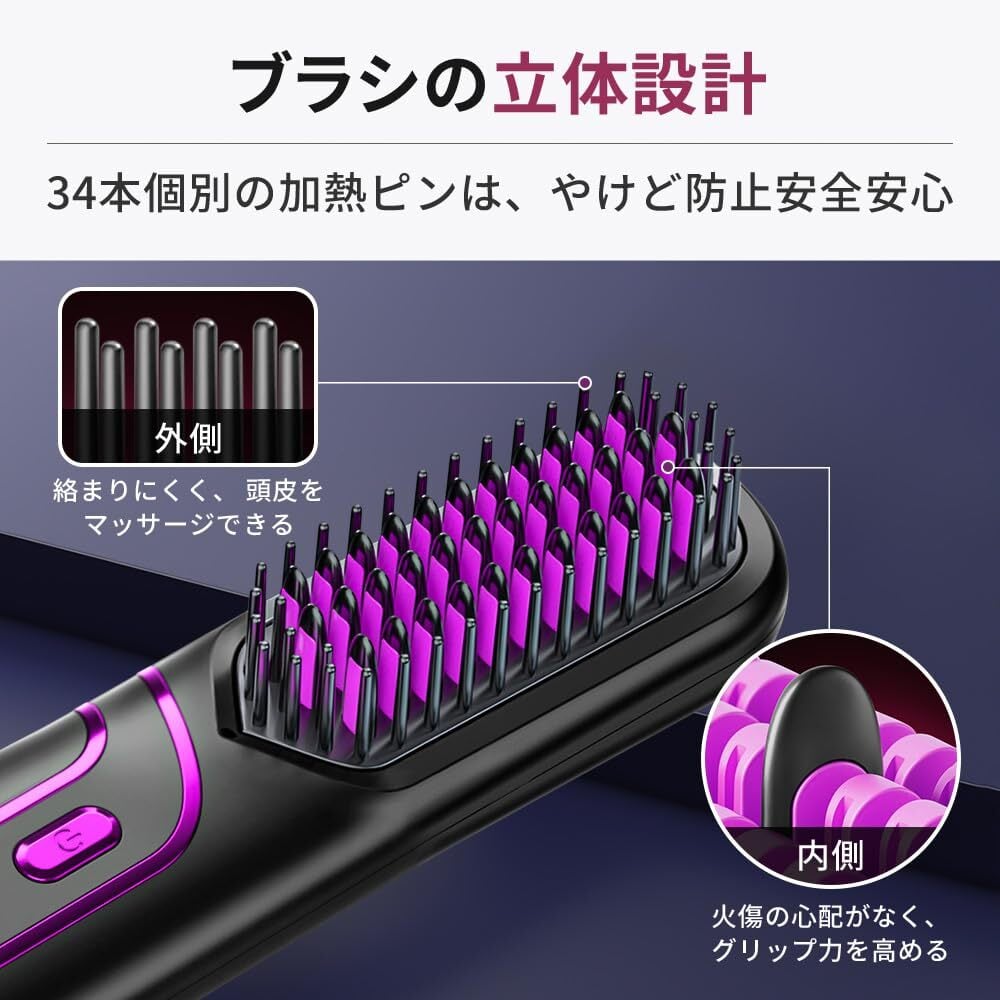 安全設計とマイナスイオン髪をケア:加熱部分が皮膚と直接接触しないように設計されており、火傷のリスクを低減しています。5D形状のブラシは、髪の毛の流れに沿って滑らかに移動し、引っかかりや痛みを感じずにハイクオリティなカールやストレートヘアを演出できます。また、セラミックコーティングにより、髪が引っかかることがなく、摩擦によるダメージを最小限に抑えます。さらに、2億個の高濃度マイナスイオン放出され、髪をダメージなく美しく艶やかに整えます。整髪とケアを両立させるこの製品は、髪の健康を大切にする方に最適です。