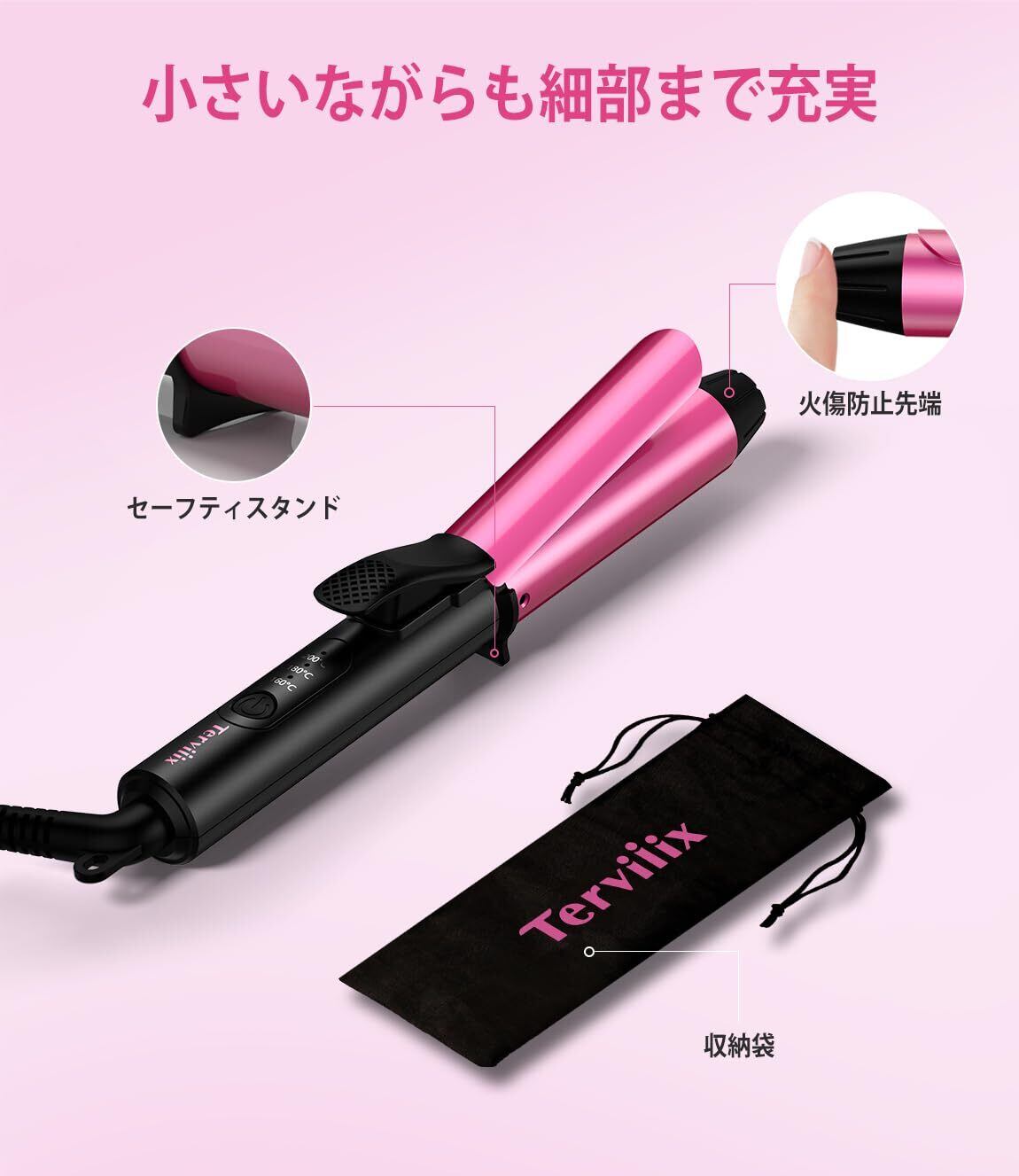 Terviiix ミニカールアイロン 25mm 持ち運びヘアアイロン 旅行用ヘアアイロンミニ 海外対応 160/180/200℃ 三段階温度設定 耐熱ポーチ付き