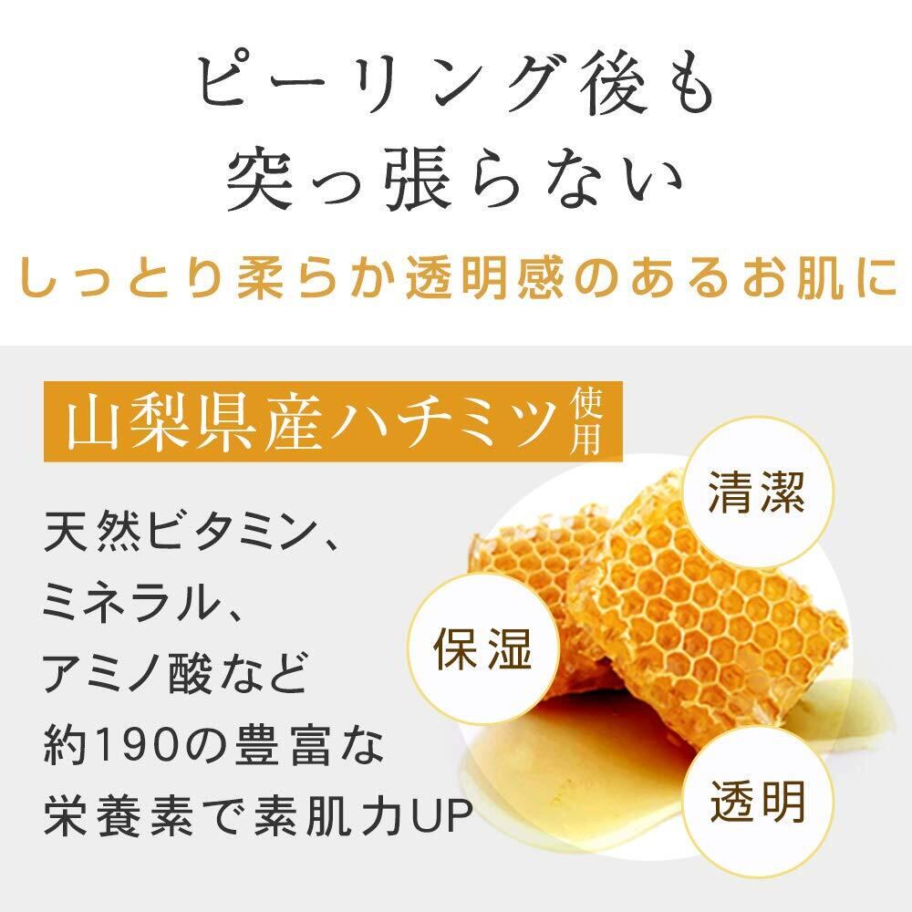 【ピーリング後も突っ張らない】ハチミツは、天然のビタミン、ミネラル、アミノ酸、有機酸、酵素、タンパク質など約190種類の栄養素が含まれている、自然界が生んだお肌に優しいマルチ美肌成分です。エイジングケア・保湿・透明を目指す美容成分も贅沢に配合。