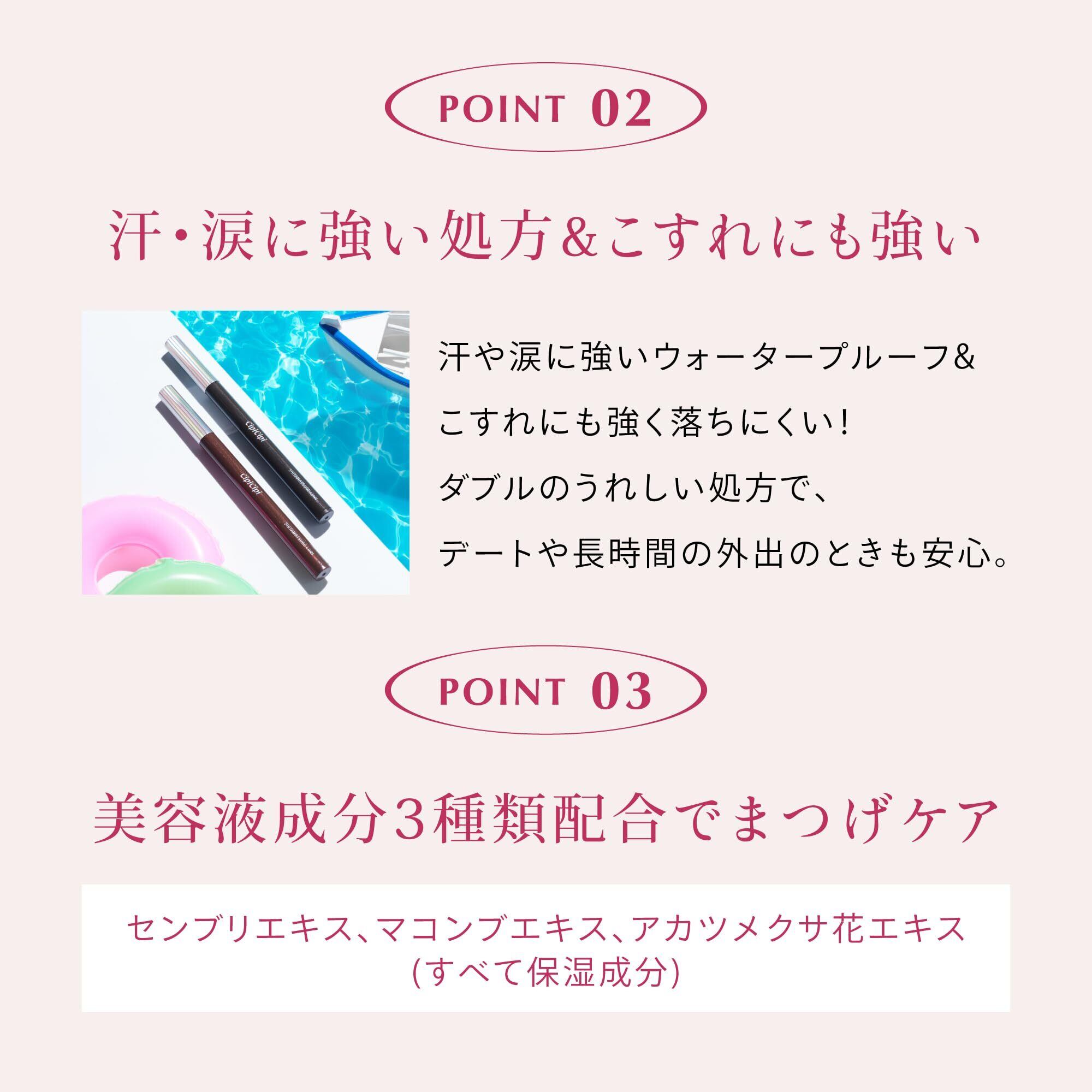 02 汗・涙に強い処方&こすれにも強い:汗や涙に強いウォータープルーフ&こすれにも強く落ちにくい!ダブルのうれしい処方で、デートや長時間の外出のときも安心。
