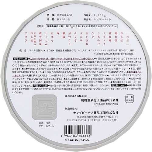 別府温泉の湯の花エキスを配合したヤングビーナス別府の湯 お徳用の大袋。2.2kg。 原材料・成分 セキス炭酸Na、ホウ酸、別府温泉精製湯の花エキス、ヒドロキシエタンジホスホン酸Na液、黄202、香料