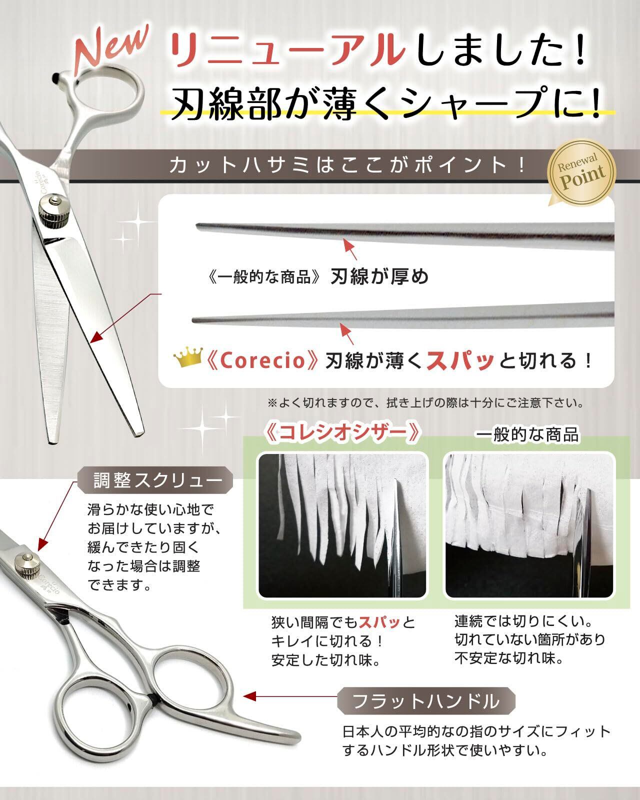 【 理美容 専門の ハサミ 職人さんに教わりました。】ハサミ の調整方法やメンテナンス、切れ味の試し方を教わり、1本ずつ検品し、なめらかな使い心地に調整してから出荷しています。 日本 人の標準的な手や指の大きさに合った大きさで、右利き 、 左利き のどちらにも使え、シンプルで飽きのこないデザインです。
