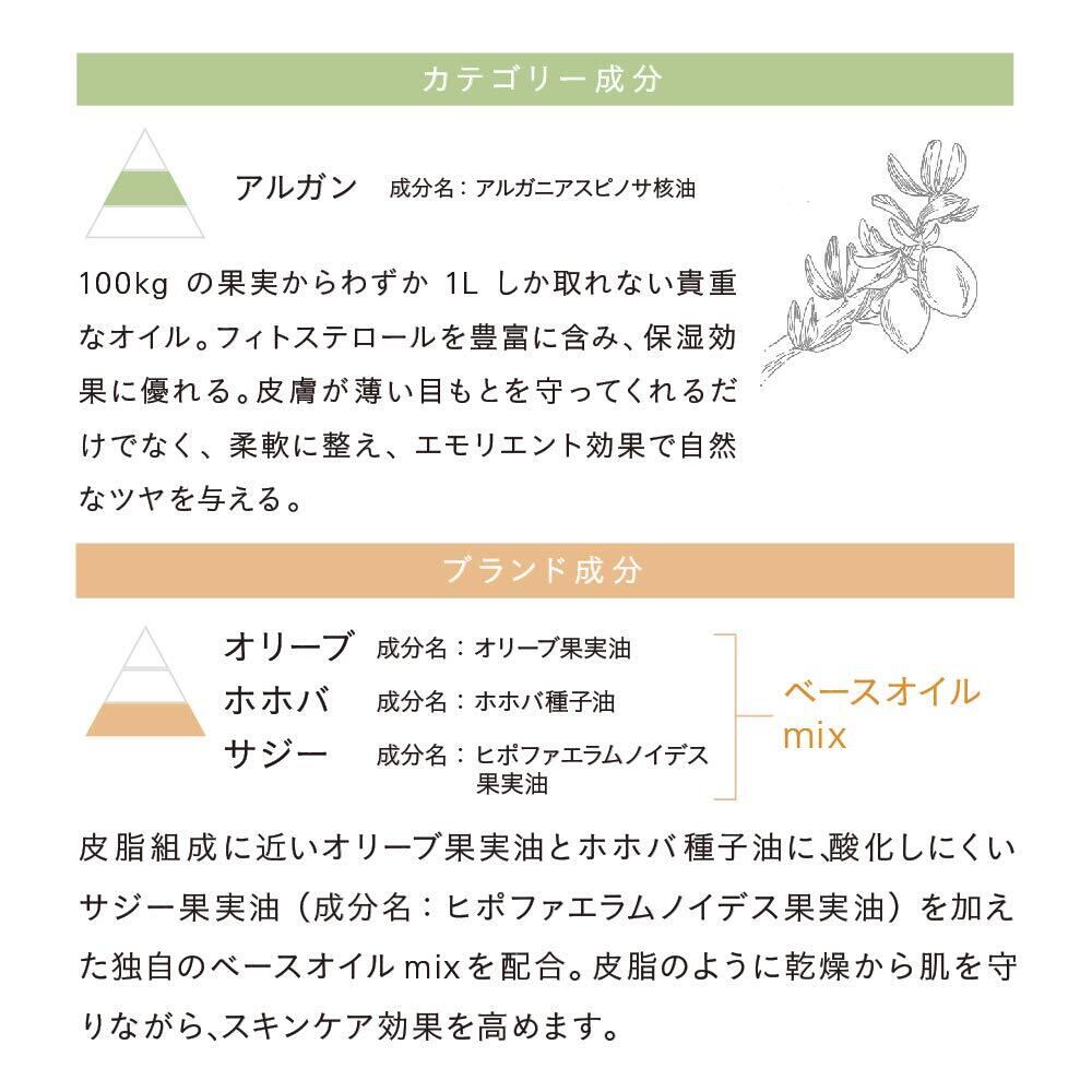 全成分:成分:ステアリン酸、モクロウ、水添ヒマシ油、タルク、ミツロウ、トリ(カプリル酸/カプリン酸)グリセリル、水添ヤシ油、オリーブ果実油*、スクワラン、ホホバ種子油*、ヒポファエラムノイデス果実油*、アルガニアスピノサ核油*、セージ葉エキス*、水添パーム油、水添パーム核油、イソステアリン酸ソルビタン、レシチン、トコフェロール、水、BG、(+/-)酸化チタン、酸化鉄、マイカ、水酸化Al *オーガニック成分