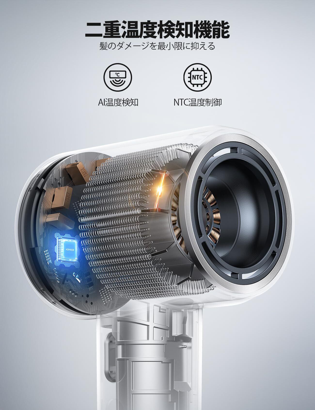 【センシング機能を搭載!AI制御】高温で頬側肌の水分が奪われるのが気になりませんか?このヘアドライヤーはNTC温度検知チップとAI温度制御二重検知機能により、毎秒100回の温度検知を行います。過熱保護機能も搭載されており、本体が105°まで上昇すると自動的に電源を切れます。熱を溜めにくく、熱ダメージ抑えてソフトな風を毛先に届けます。艶やかで手触りの良い髪に