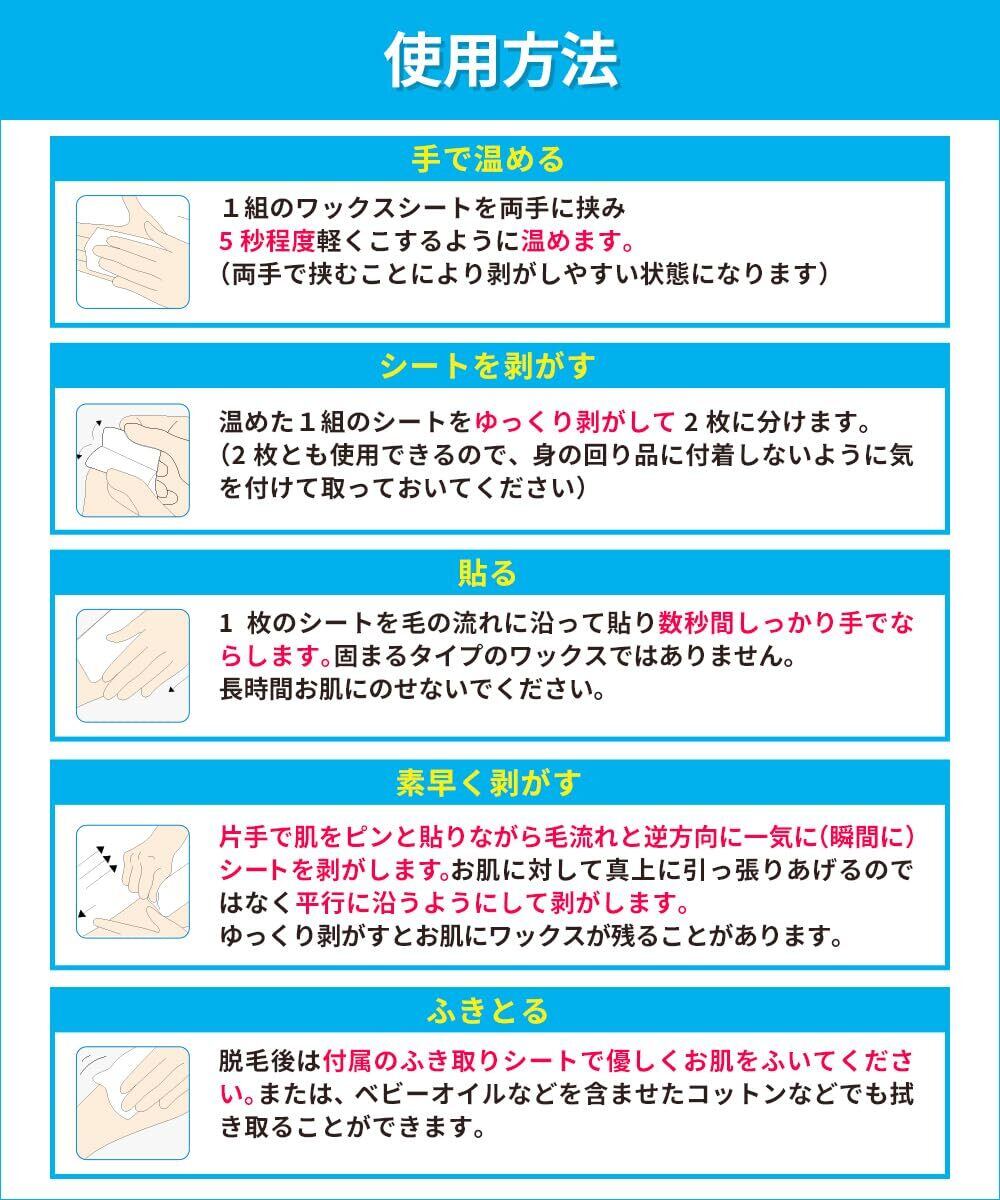 【使用方法】①5秒程度かるくこすり、手で温める。 ②シートをゆっくりはがして2枚にわける ③毛の流れに沿って貼り、数秒間しっかり手でならす ④毛流れと逆方向に素早く剥がす ⑤拭き取りシートでやさしくお肌をふきとる
