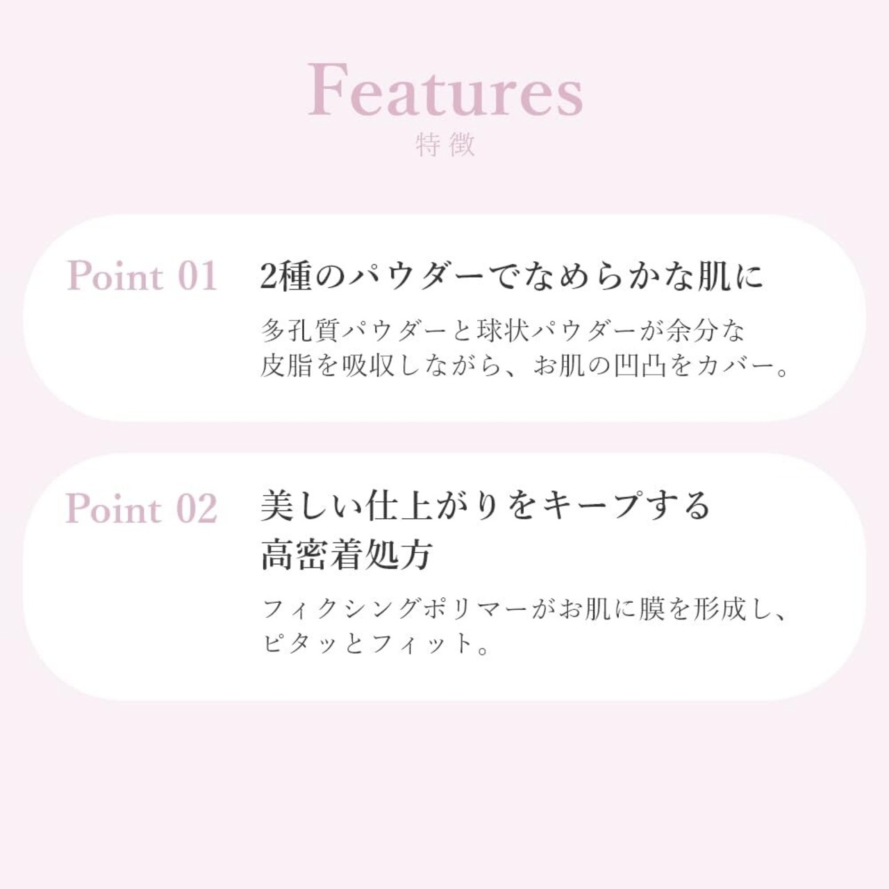 Point 01. 2種のパウダーでなめらかな肌に 多孔質パウダーと球状パウダーが余分な皮脂を吸収しながら、お肌の凹凸をカバー。