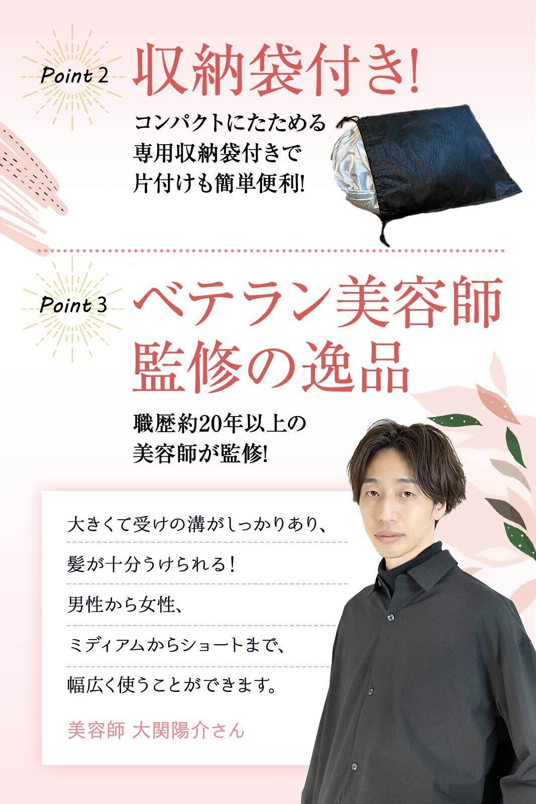 ・【美容師が監修】ベテラン美容師の監修による自宅での散髪に便利な散髪用ケープ。 ・【大きくて髪が散らからない】大き目サイズなので、大柄な男性でも安心。溝が深いので、髪がこぼれません。 お子様~お年寄りまで、男性のみならずミディアムからショートまでの女性もお使いいただけます。 ・【収納便利】折り畳み式で使用しないときは、小さくまとめることができ、収納袋付きなので片付けも簡単 ・【サイズ】使用時/直径約70cm、収納時/約30cm 約120g。 ・【アレルギー検査済】 国内検査機関によるホルムアルデヒド検査済み。お子様にも安心。