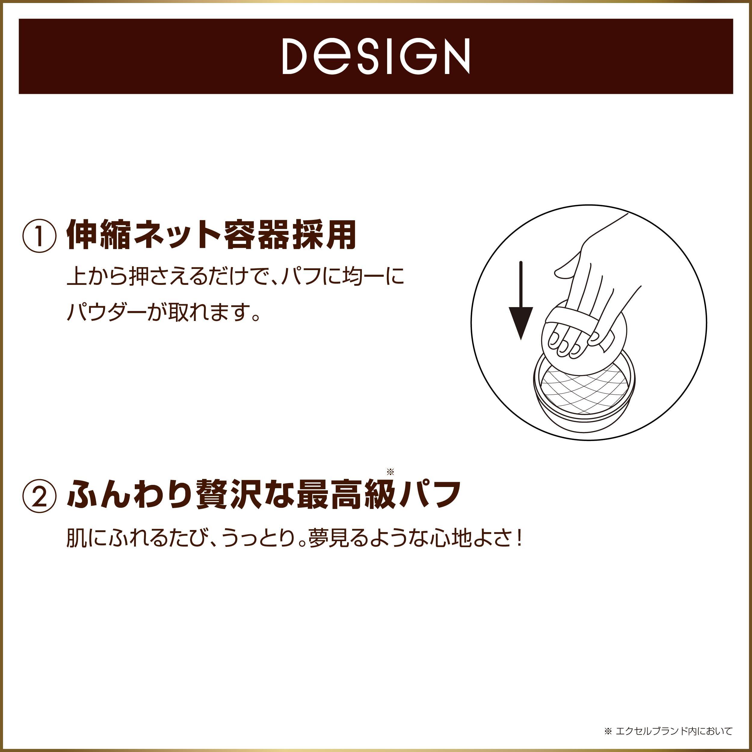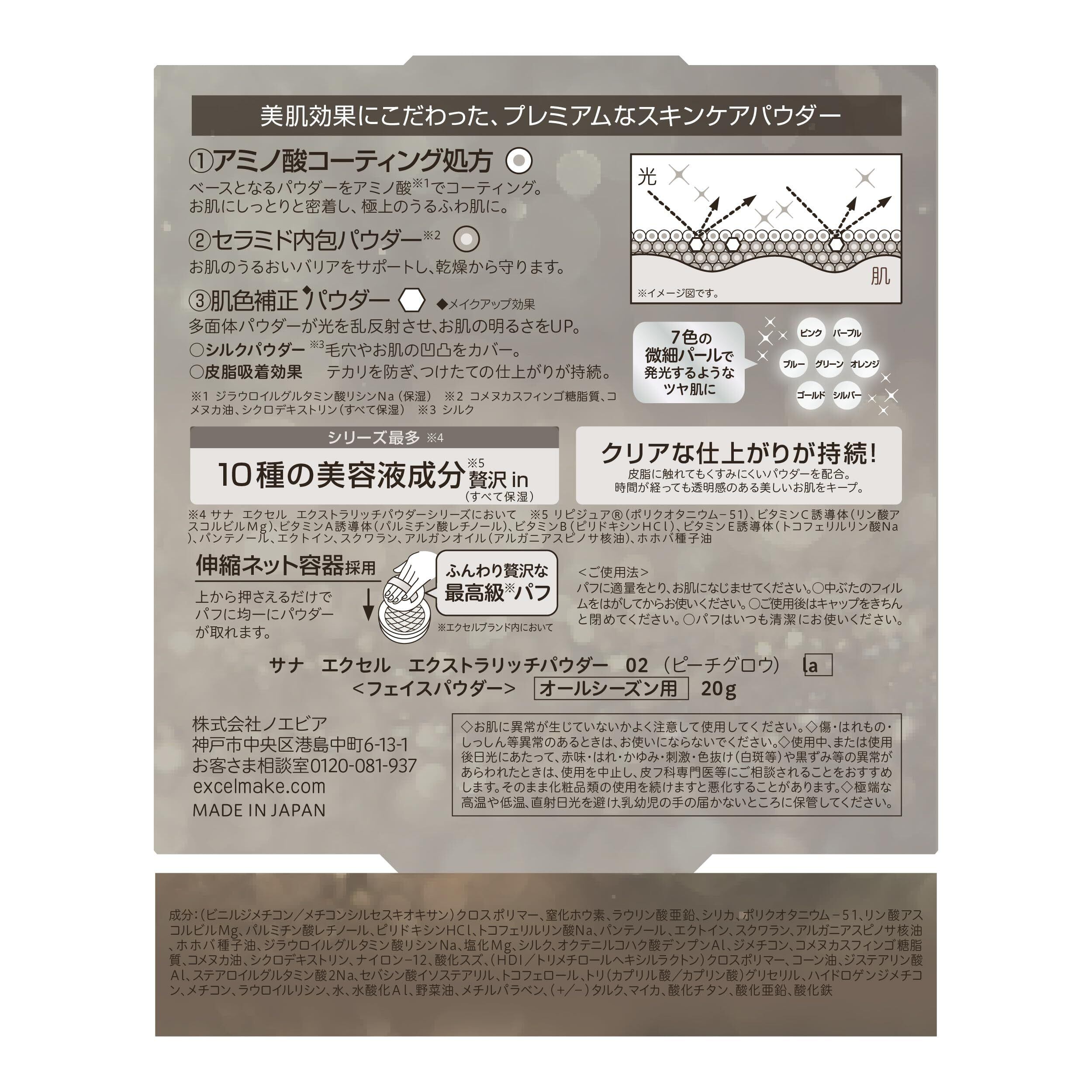 7色パールでふわツヤ肌 美肌効果にこだわった、プレミアムなスキンケアパウダー 1.アミノ酸コーティング処方 ベースとなるパウダーをアミノ酸※1でコーティング。 お肌にしっとりと密着し、極上のうるふわ肌に。 2.セラミド内包パウダー※2 お肌のうるおいバリアをサポートし、乾燥から守ります。 3.肌色補正◆パウダー ◆メイクアップ効果 多面体パウダーが光を乱反射させ、お肌の明るさをUP。 ○シルクパウダー※3:毛穴やお肌の凹凸をカバー。 ○皮脂吸着効果:テカリを防ぎ、つけたての仕上がりが持続。 ※1 ジラウロイルグルタミン酸リシンNa(保湿) ※2 コメヌカスフィンゴ糖脂質、コメヌカ油、シクロデキストリン(すべて保湿) ※3 シルク 7色の微細パールで発光するようなツヤ肌に ピンク パープル ブルー グリーン オレンジ ゴールド シルバー シリーズ最多※4 10種の美容液成分※5贅沢in(すべて保湿) ※4 サナ エクセル エクストラリッチパウダーシリーズにおいて ※5 リピジュア(ポリクオタニウム-51)、ビタミンC誘導体(リン酸アスコルビルMg)、ビタミンA誘導体(パルミチン酸レチノール)、ビタミンB(ピリドキシンHCl)、ビタミンE誘導体(トコフェリルリン酸Na)、パンテノール、エクトイン、スクワラン、アルガンオイル(アルガニアスピノサ核油)、ホホバ種子油 クリアな仕上がりが持続! 皮脂に触れてもくすみにくいパウダーを配合。 時間が経っても透明感のある美しいお肌をキープ。 伸縮ネット容器採用 上から押さえるだけでパフに均一にパウダーが取れます。 ふんわり贅沢な最高級※パフ ※エクセルブランド内において オールシーズン用