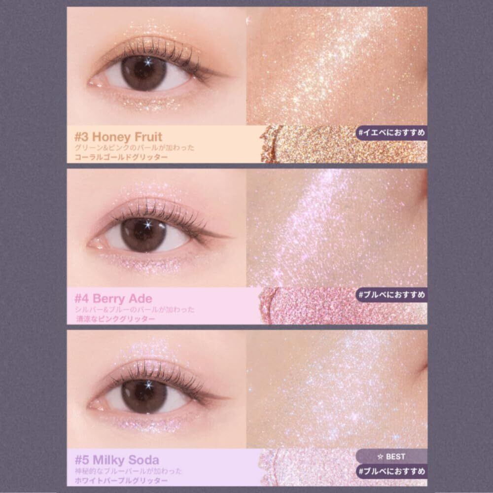 キラキラの仕上がり: 大きなグリッターが配合されており、目元に華やかさを与えます。