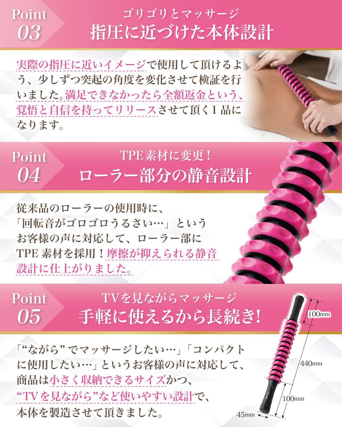 【こだわり】様々なメーカーから 筋膜リリース 用品として” フォームローラー ”や” 筋膜ローラー ”として 回転式の マッサージローラー が販売されていますが、Rozallyの マッサージスティック は”こだわり”が一味違います。 マッサージ棒 や エステ用品 など 体のメンテナンス アイテムをメインに取り扱っている10社以上の工場からサンプルを取り寄せ、「指圧に近い突起」を一緒に試行錯誤して頂けた1社に絞って発注を行なっています。 本商品の使用前にご入浴の上、ご自身の指圧にて セルフ マッサージ で ほぐし を行うと一層リラックスいただけます。
