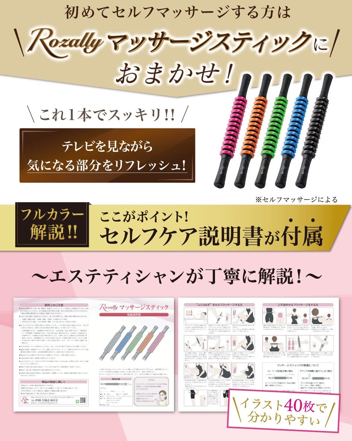 【エステティシャン監修】 Rozally マッサージスティック がついに正式販売開始。ふくらはぎ の むくみ や 肩こり が気になる方に注目されている ローラー タイプ の” マッサージスティック ”です。 長時間のデスクワークや立ち仕事でカチカチに疲れてしまった筋肉に コロコロ と当てて頂き心地よい リラックス タイムを過ごして頂くために開発。企画&設計では【現役エステティシャン】の先生からアドバイスをもらい、 足 の むくみ や 肩こり など色々な使用方法を説明書として添えて企画&開発しました。