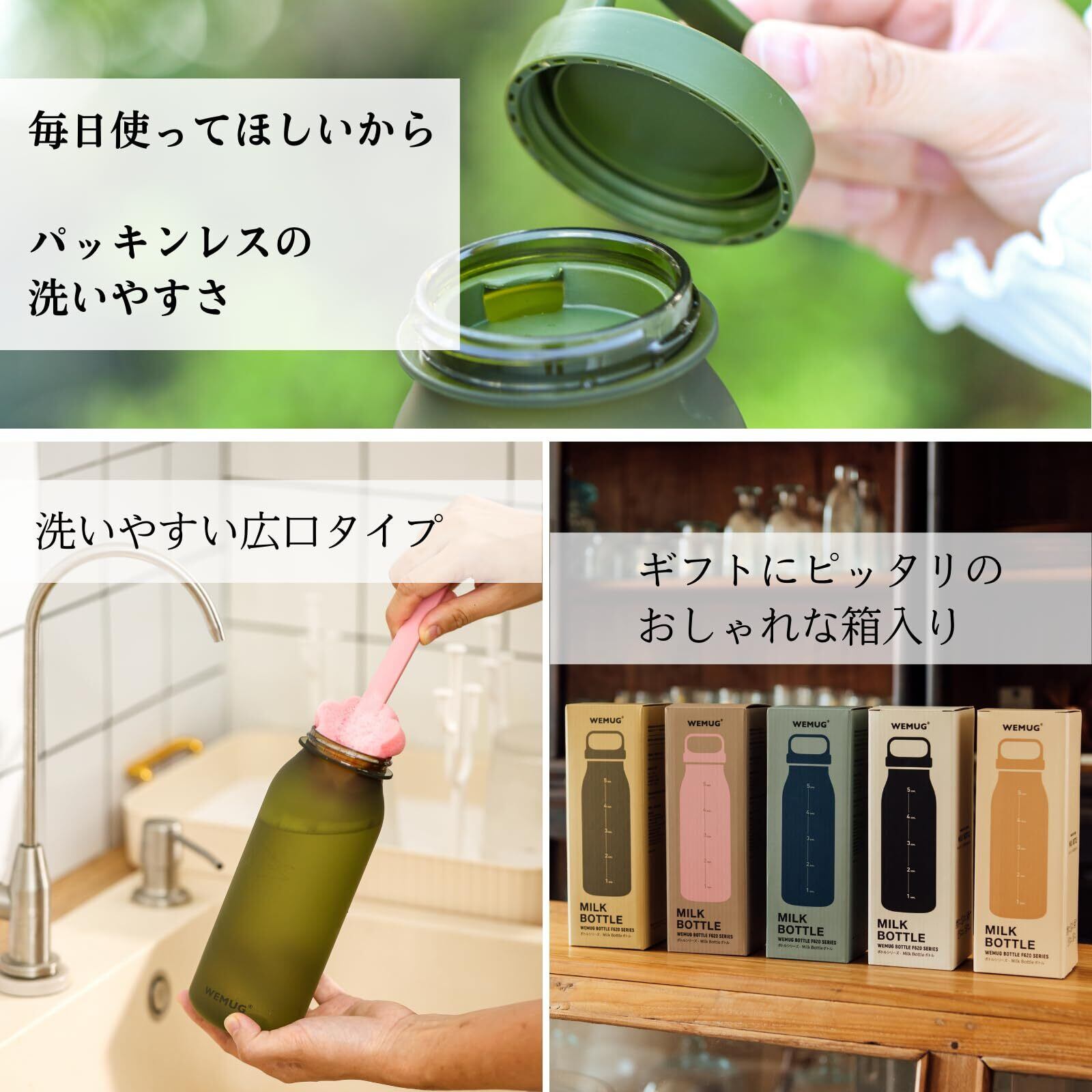WEMUGの特徴はスタイリッシュなデザインと高い機能性。1. 横置きしてもひっくり返しても水漏れしない高い密閉性(シリコン不使用だから洗いやすい!)。2. 持ち歩くものだから軽いものを選ぼう!超軽量、なのに丈夫なBPAフリーのプラスチック素材を使用。3. 広口で飲みやすい、洗いやすい構造。