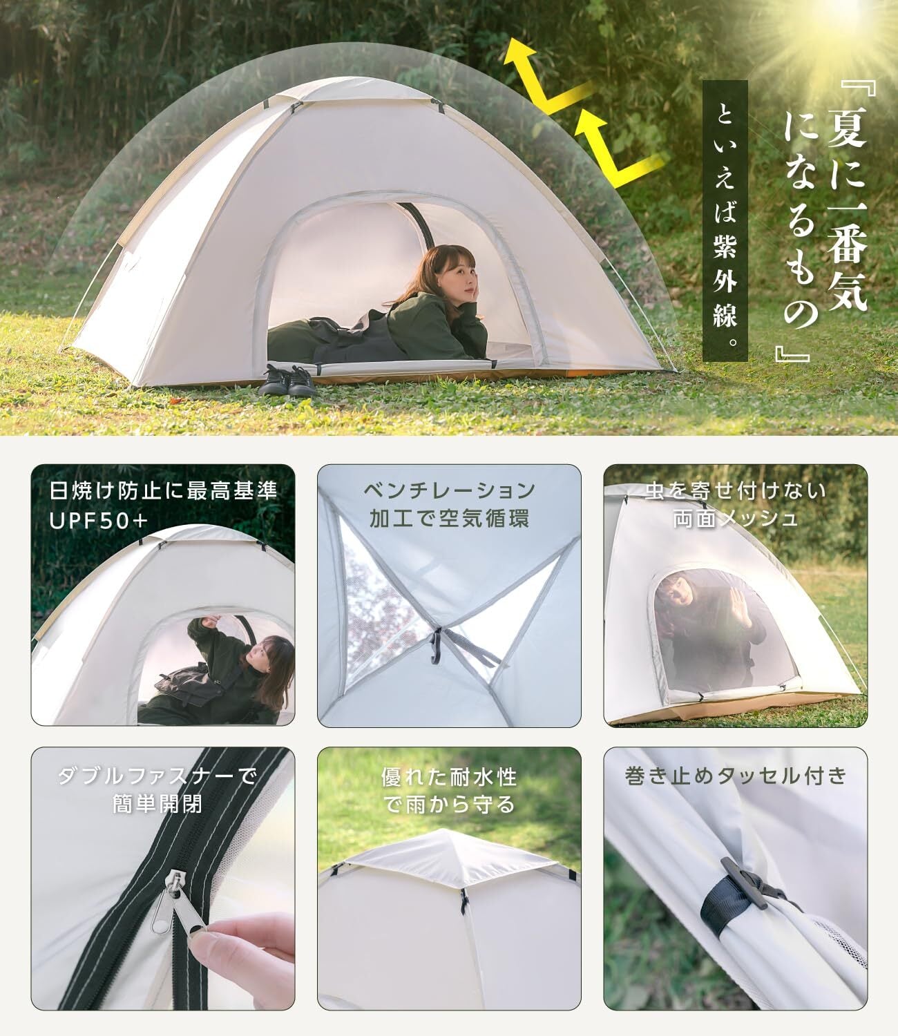 【UVカット&優れた耐水性】テントシート素材はポリエスレルのオックスフォード織。柔らかい手触りと強度があります。オックスフォード織は気孔が多く、厚地ですが通気性に富んでいて夏場には最適です。さらにシート裏面にはUVシルバーコーティングが施され、遮熱性、遮光性に優れ、UVカットは世界基準UPF50+の最大99%カット値を認証されています。炎炎夏の日差しからしっかりと身を守り、紫外線による肌のダメージを軽減します。アウトドア活動をより安心して楽しむことができます。また、耐水圧2,000㎜の高い防水性があり、荒天に配慮された安心なテントです。