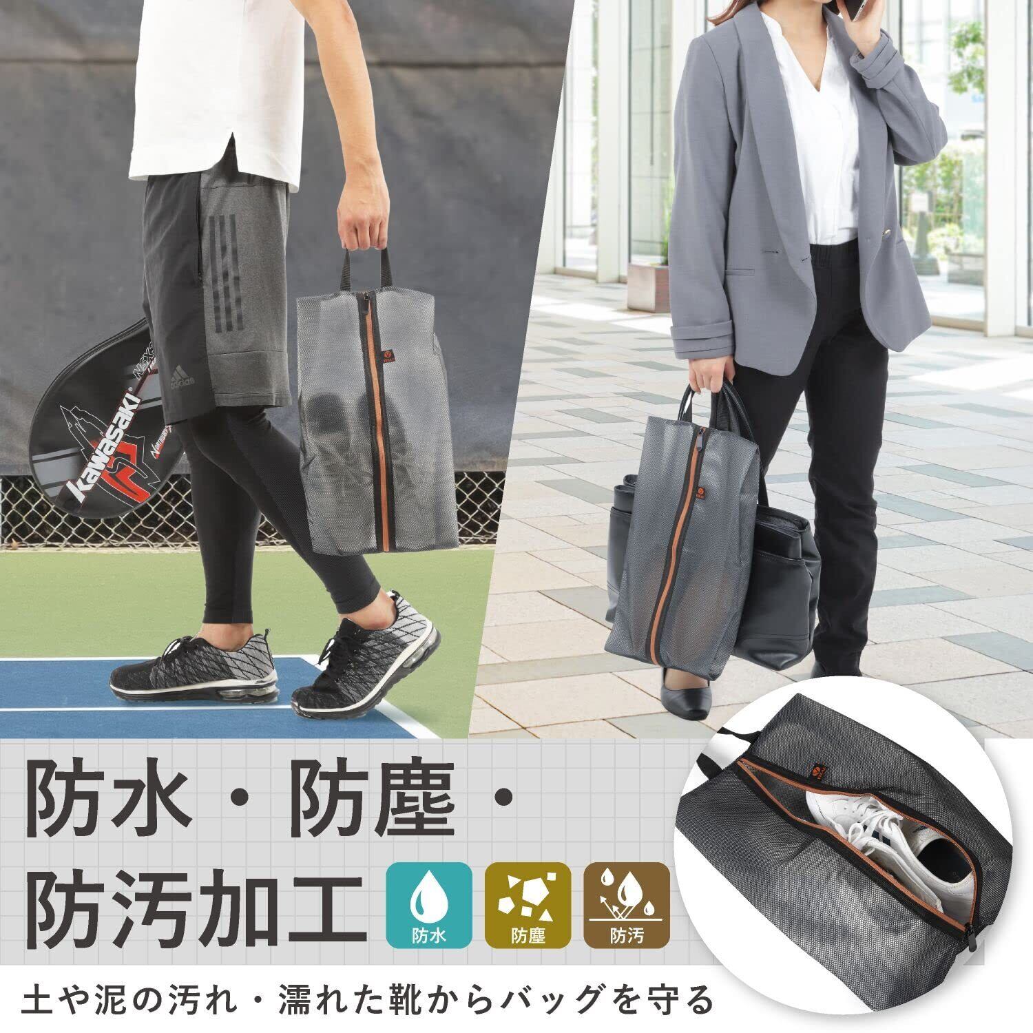 【雨の日でも持ち歩ける防水バッグ】ポリエステル製の シューズバッグ です。防水性に優れておりますので雨の日に シューズ を雨から守ります。
