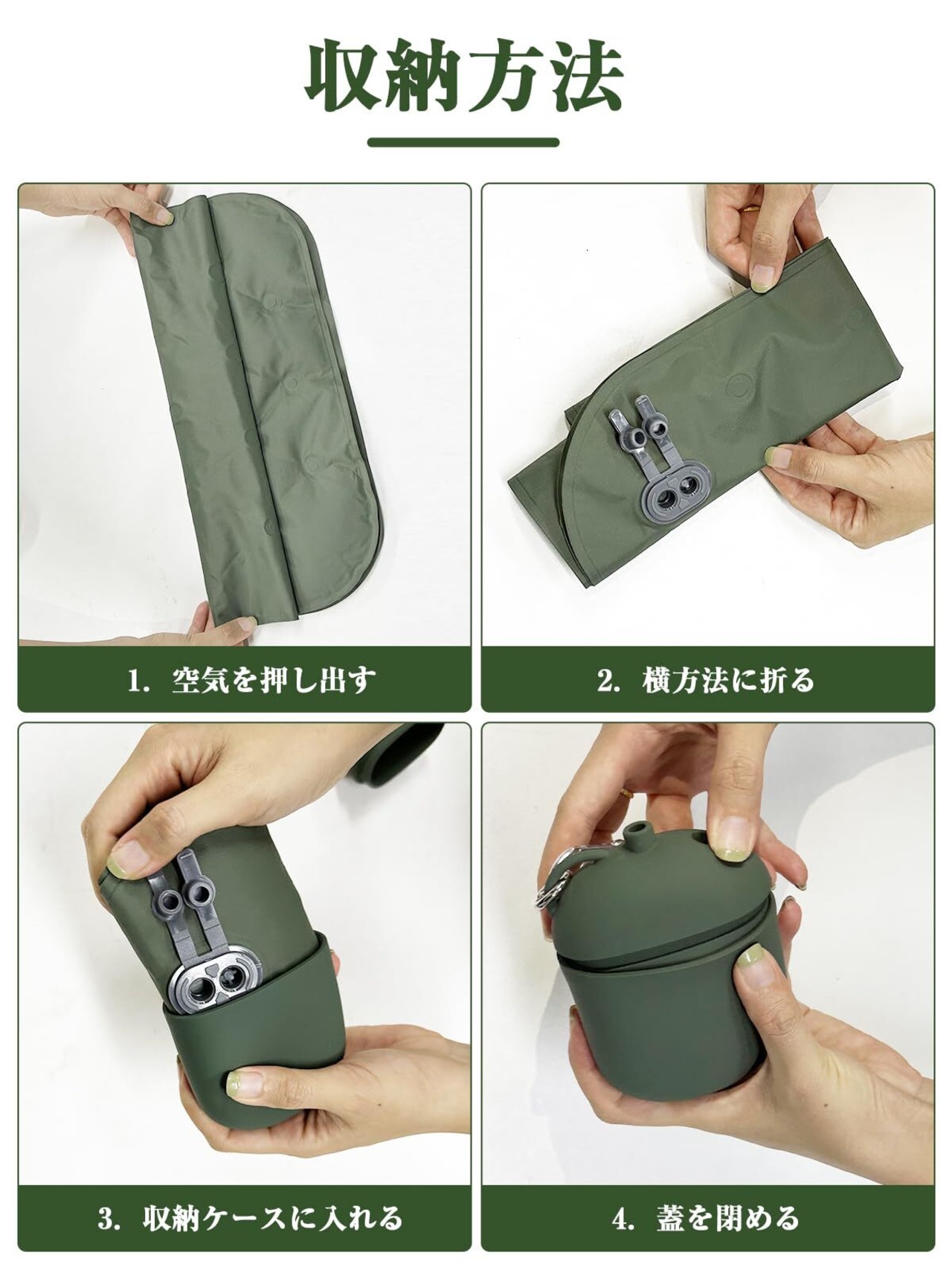 【優れた断熱性】繊維が編み込まれたかなり強靭な生地で造られたエアー座布団です。シリコン製のケースに収納されているんですが、ケースがそのままエアーポンプになり口で息を吹き込まなくても30回~程シュコシュコすればパンパンに膨らみます。空気のお陰でパツンパツンな座り心地ですし、地面からの熱さ冷たさを遮断してくれて快適です。
