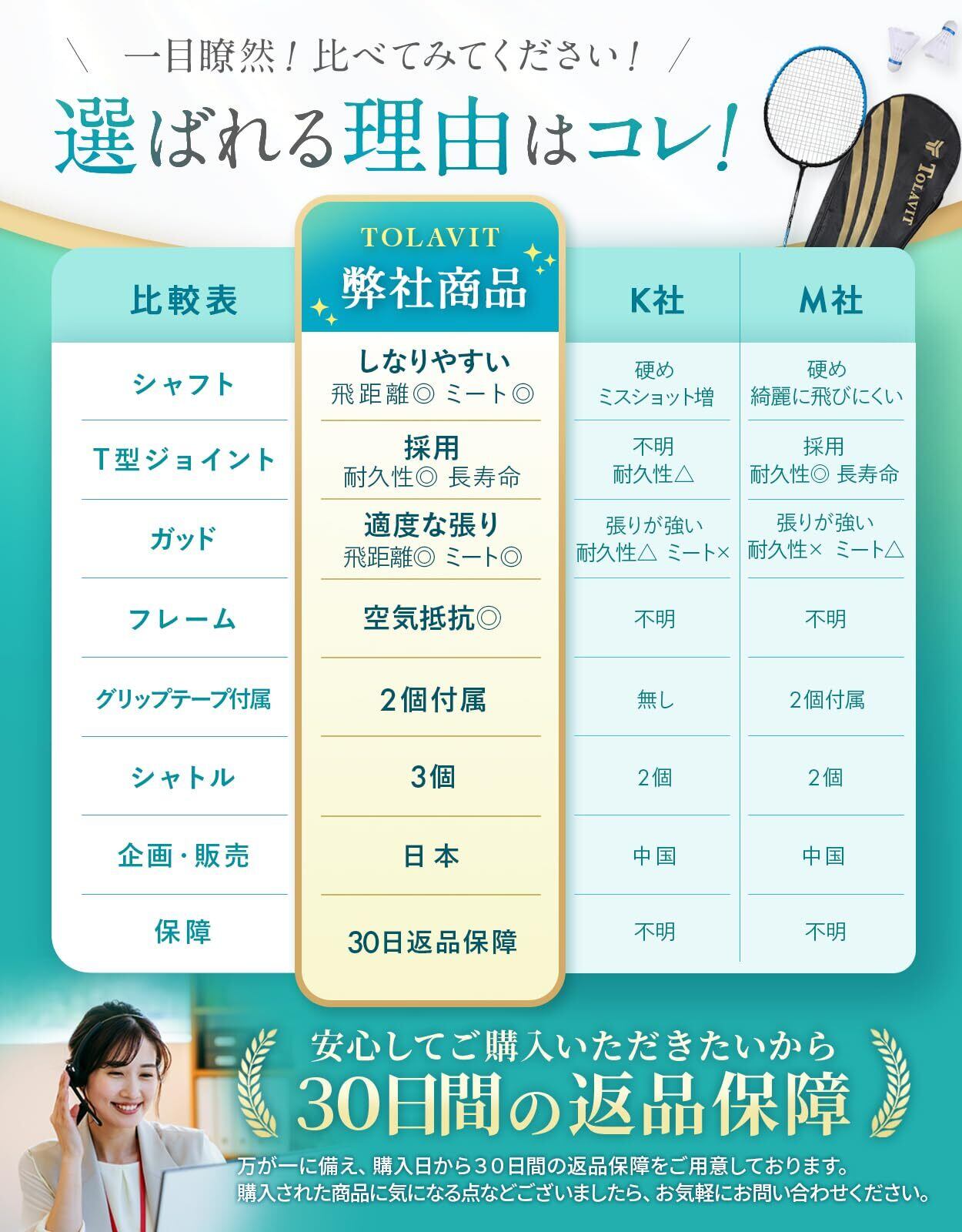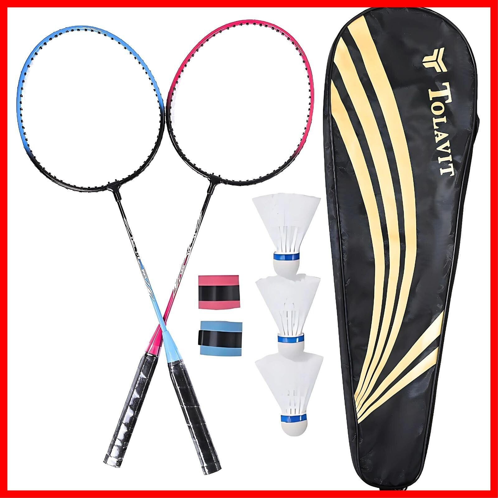 TOLAVIT【高性能バドミントンセット – 超軽量ラケット・特大スイートスポット&高精度シャフトで遠くに飛ばす!安心安全の素材!】 初心者向け! 2本セット&4本セット シャトル、グリップテープ、ラケットケース付き