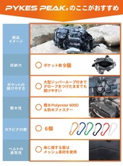 【仕様 / セット内容 / メーカー】 【仕様】本体サイズ:280mm × H200mm × D90mm ウエストベルト長さ : 530~1000㎜ ショルダーベルト長さ : 870~1130㎜ 【材質】表地 : ポリエステル 裏地 : ポリエステル 【セット内容】本体×1、カラーカラビナ×6 【カスタマーサービス】PYKES PEAKは日本のメーカーです。カスタマー対応も日本人スタッフが日本語で丁寧に対応いたします。