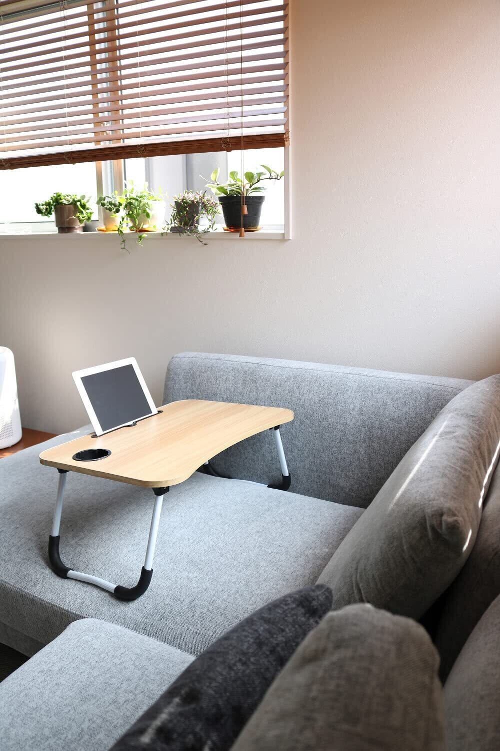 トレードワン 折りたたみガジェットテーブル ブラウン ベット リモートワーク コンパクト 耐荷重10kg タブレットスタンド ドリンクホルダー付き 持ち運び便利