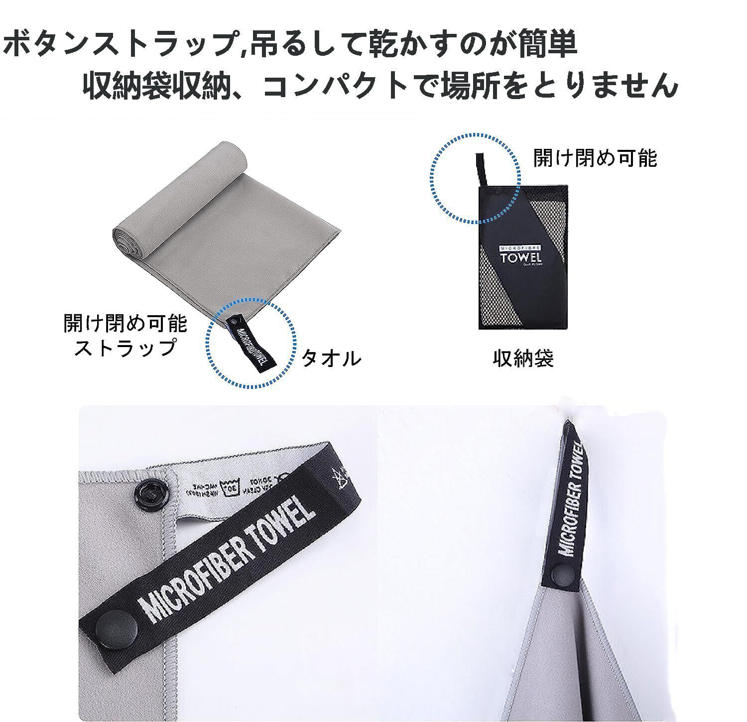 スポーツタオル 速乾タオル 高吸水 肌に優しい生地、マイクロファイバー、軽量、保管と持ち運びが簡単、収納袋 ボタン付きストラップデザイン
