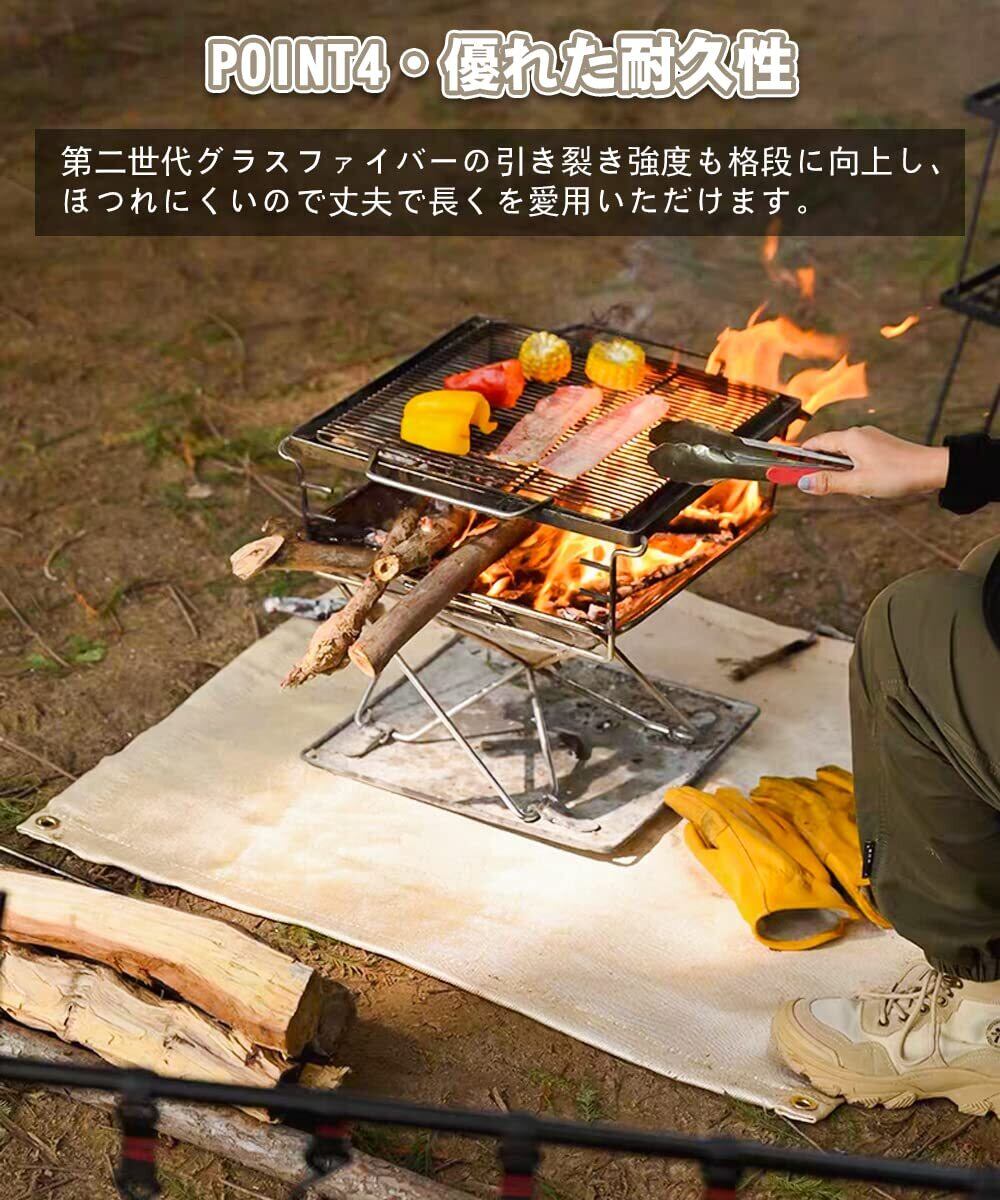 【第二世代の焚き火シート】技術のアップグレードで、熱伝導率の低さに秀でたグラスファイバー織物を採用しており、作業耐熱温度700℃、瞬間使用温度1300℃の高熱にも耐えられる安心仕様となります。しっかりと厚みのある丈夫な生地で、焚き火シートは熱や火の粉の影響を受けず、長期間ご利用いただけます。