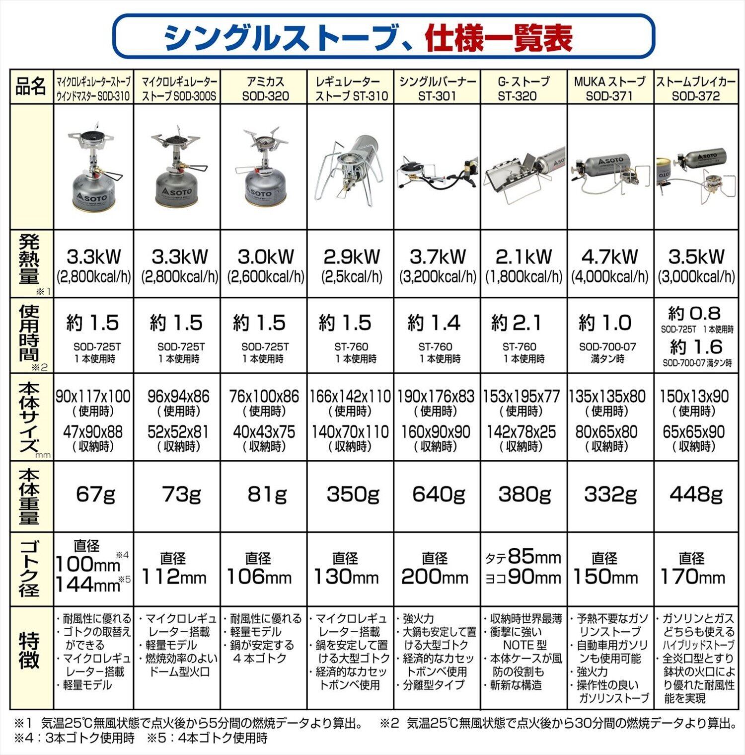 使用燃料:SOTO製品専用容器(ボンベ) [OD缶] (SOD-725T)、使用時間:約1.5時間 (SOD-725T 使用時) ※気温25℃無風状態で点火後から30分間の燃焼データより算出