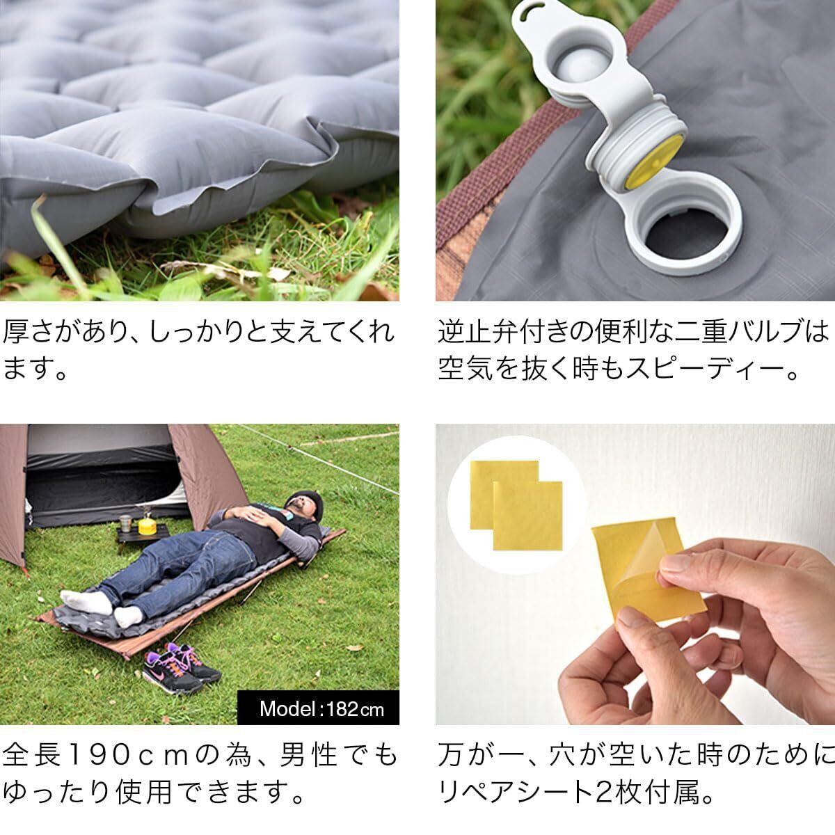 【撥水加工&TPUコーティング】 生地には撥水加工とTPUコーティングが施されています。水に強く、汚れにも強いのでハードな環境でも安心。さらに、生地は耐久性あるリップストップ生地を使用。 【簡単に膨らむエアーマット】 10回ほど空気を吹き込むだけで簡単に膨らみます。バルブは逆止弁付きで、空気を入れている時も漏れないので、女性でも簡単にセッティングすることができます。