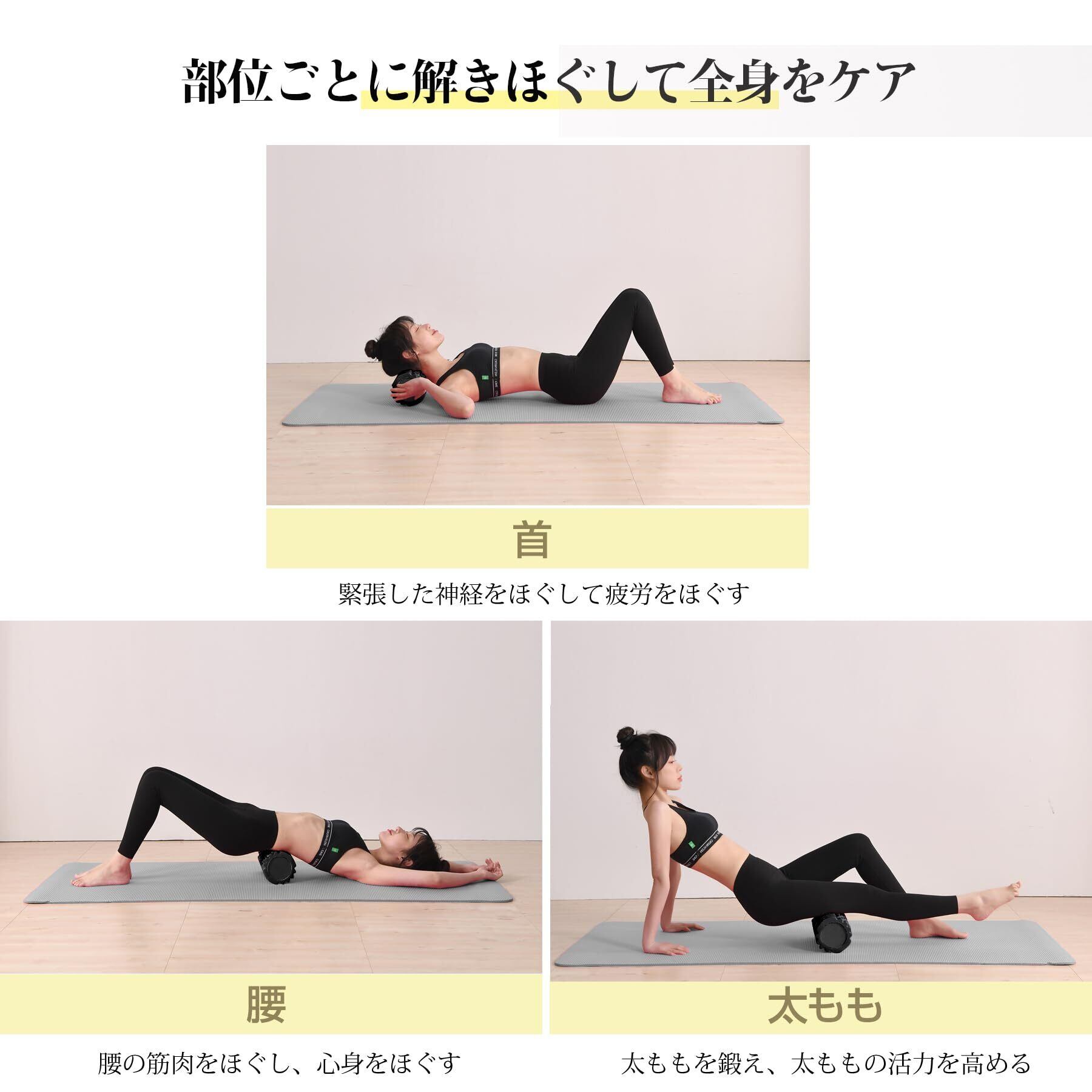 【筋膜リリース】 フォームローラー の表面は、手のひら、指、指先の形状を模した凹面と凸面の3種類のデザインを採用し、指の腹のような硬さを持ちながら、セルライトのリリース、全身のリラックスに役に立ちます。每日3〜10回で済みます。数分で身体の疲労をほぐすできます。家でスマホをいじったり、テレビを見たりしながらリラックスやトレーニングができます。オフィスエリア、自宅、ヨガ教室、ジム、フィットネスクラブなどの運動に使用できます。使用を続ける事で日頃の運動不足解消や疲労にも適します。