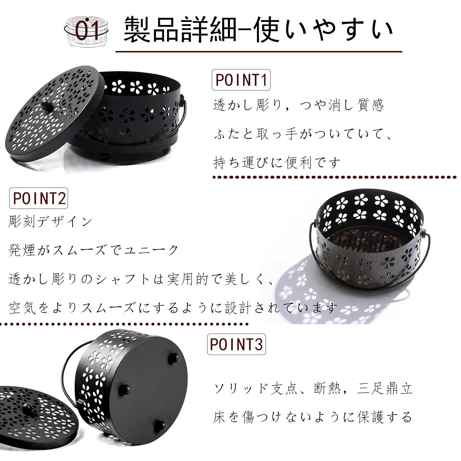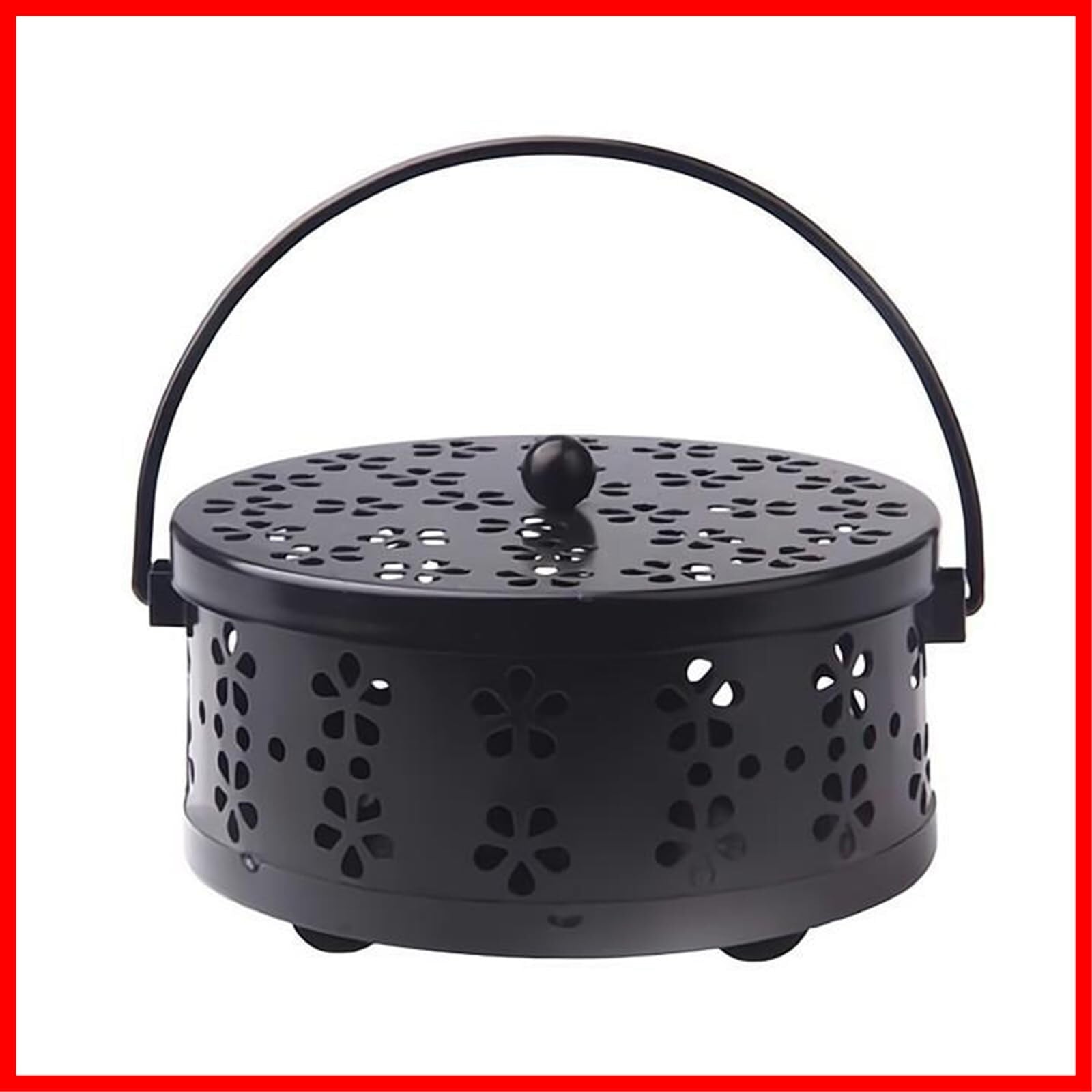 【安全なデザイン】鉄製でどっしりした重さがあり、蓋と取っ手付きのオシャレな蚊取り線香ホルダー。花柄の形をした穴より風通しがよく、可愛らしい丸い取っ手の蓋と3点の足も付いていますので安全性があります。