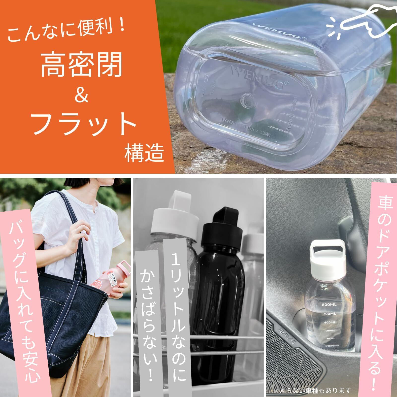 WEMUGの特徴はスタイリッシュなデザインと高い機能性。1. 横置きしてもひっくり返しても水漏れしない高い密閉性(シリコン不使用だから洗いやすい!)。2. 持ち歩くものだから軽いものを選ぼう!超軽量、なのに丈夫なBPAフリーのトライタン素材を使用。3. 広口で飲みやすい、洗いやすい構造。