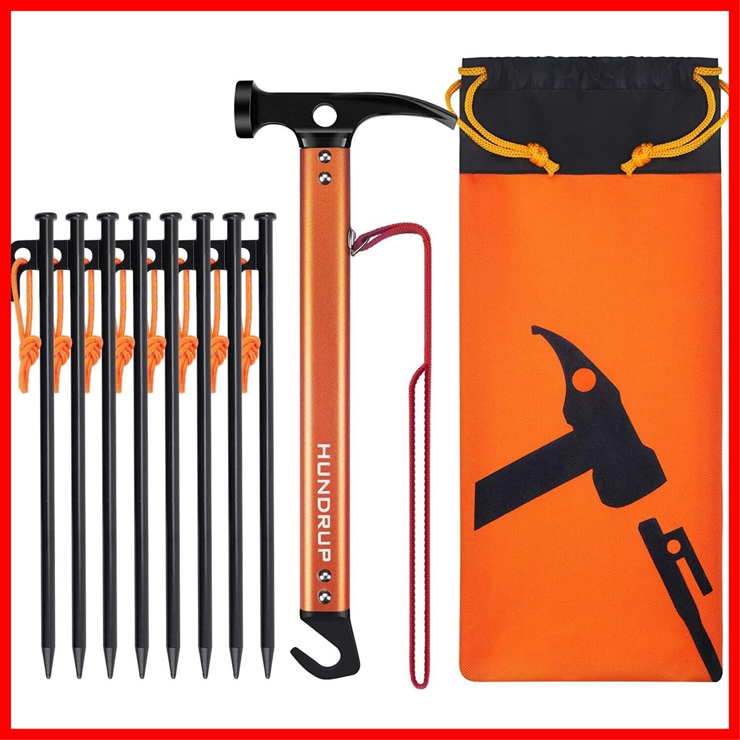 【特価セール】HUNDRUP【強化版】 (ペグハンマー/30cmペグ 8本+ハンマーセット) キャンプハンマー 鍛造ペグ 反射材入りロープ付き 高炭素鋼 ハンマー 固定用リベット追加 収納袋付き(ランダム色) 3in1多機能 テントハンマー アルミ製 軽量 ペグ打ち ペグ引き 土堀り アウトドア 登山 ツーリングキャンプ 防災 設営用具 日常作業 | カウカウ物販