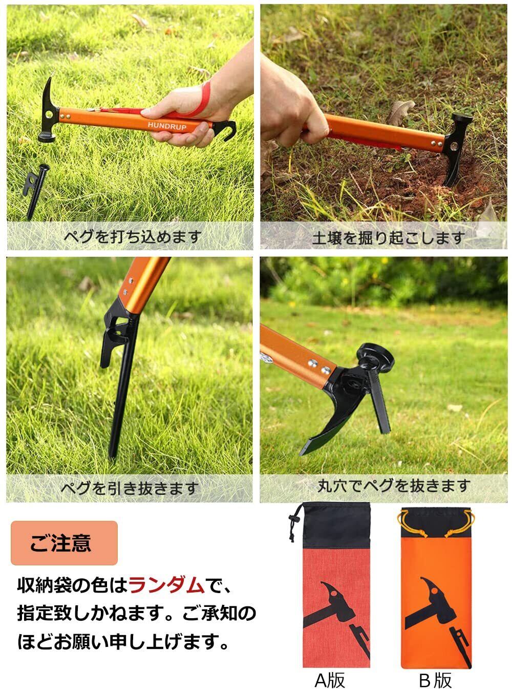 【3in1多機能ハンマー】:ペグ打ち、各種ペグの抜き、土掘りがこれ1本でこなします!①ヘッド部分が簡単にペグをしっかり打ち込めます;②ヘッド片側はスコップとして使え、土壌や砂などを掘り起こすことができます;③丸穴部分がハンマーを掛けるだけでなく、ペグを真上に引き抜くのもできます;④下のフック部分はソリッドステークも引っ掛けて簡単に抜くこともできます。キャンプ、防災、山登り、ハイキング、日常作業などのシーンでも大活躍です。