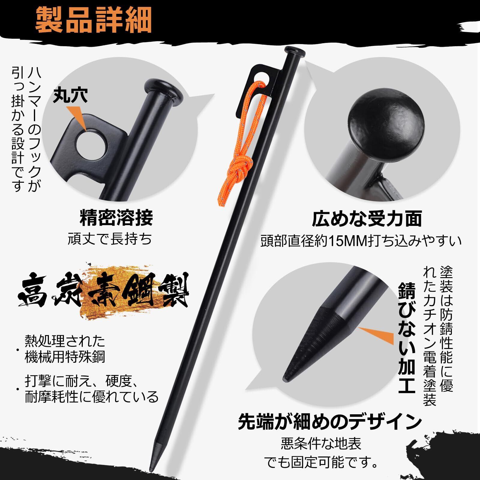 【夜光ロープ付きのテントペグ】:他社の折れやすいアルミペグと違って、当社のペグハンマーセットはS45C鋼製のキャンプペグが8本付き、頑丈で折れにくい。砂利や石が混じった固い地面でも入り込みが良く、ガッチリと固定します。ペグ表面は黒電着塗装処理を施すことにより、防錆性能が抜群です。それに、夜光ロープをテントペグのヘッド部に付けて、夜間の目印として安全に使用できます。