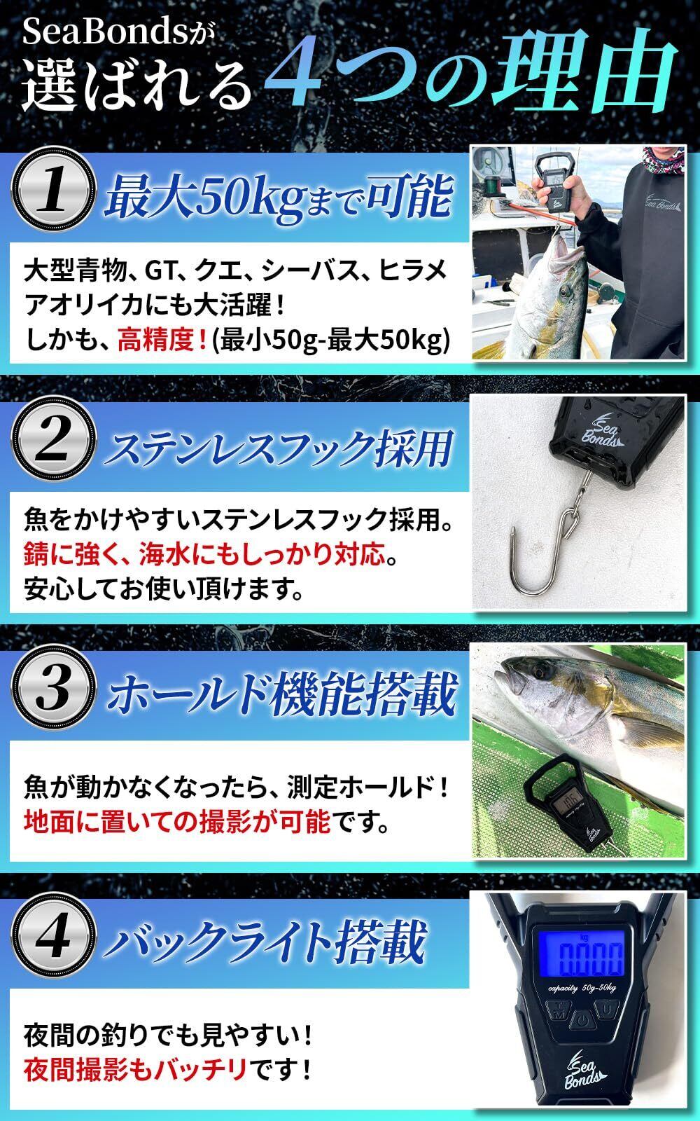 SeaBonds フィッシングスケール 防水 デジタルスケール 釣り IPX7 日本ブランド 100日 スケール 吊りはかり 吊りスケール デジタル秤 釣りはかり Gスケール 計測ツール アウトドア 軽量 50kg バックライト付 ドラグチェッカー 説明書付き (ブラック) シーボンズ
