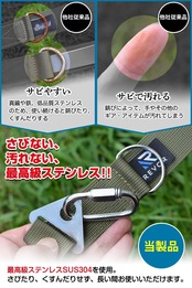 ご注意くださいカラビナのバリにご注意ください。指を切るお怪我が発生しております。バリがあれば、やすりやマイナスドライバーのような硬いもので削り落としてください。ご迷惑をお掛けしまして、誠に申し訳ございません。仕様変更のお知らせ従来のハトメより頑丈な三角プレート仕様に変更しました!類似品にご注意ください 類似品のDカン、カラビナは錆びて汚れます。弊社製は錆びない最高級ステンレスを使用しています。緩む場合の対処方法 設置後にベルトが緩む場合は、一旦バックルからベルトの抜き取り、バックルの押しボタンの反対側からベルトを入れて、バックルでベルトがしっかりロックするように入れなおしてください!たった3秒で長さ調整できる「簡単!小川張りベルト!!」ボタンを押して引くだけの簡単操作!従来品のお客様のお悩み「長さ調整が難しい」「強度が弱い」「設置中に外れる」「好みの色がない」を全て解決!!