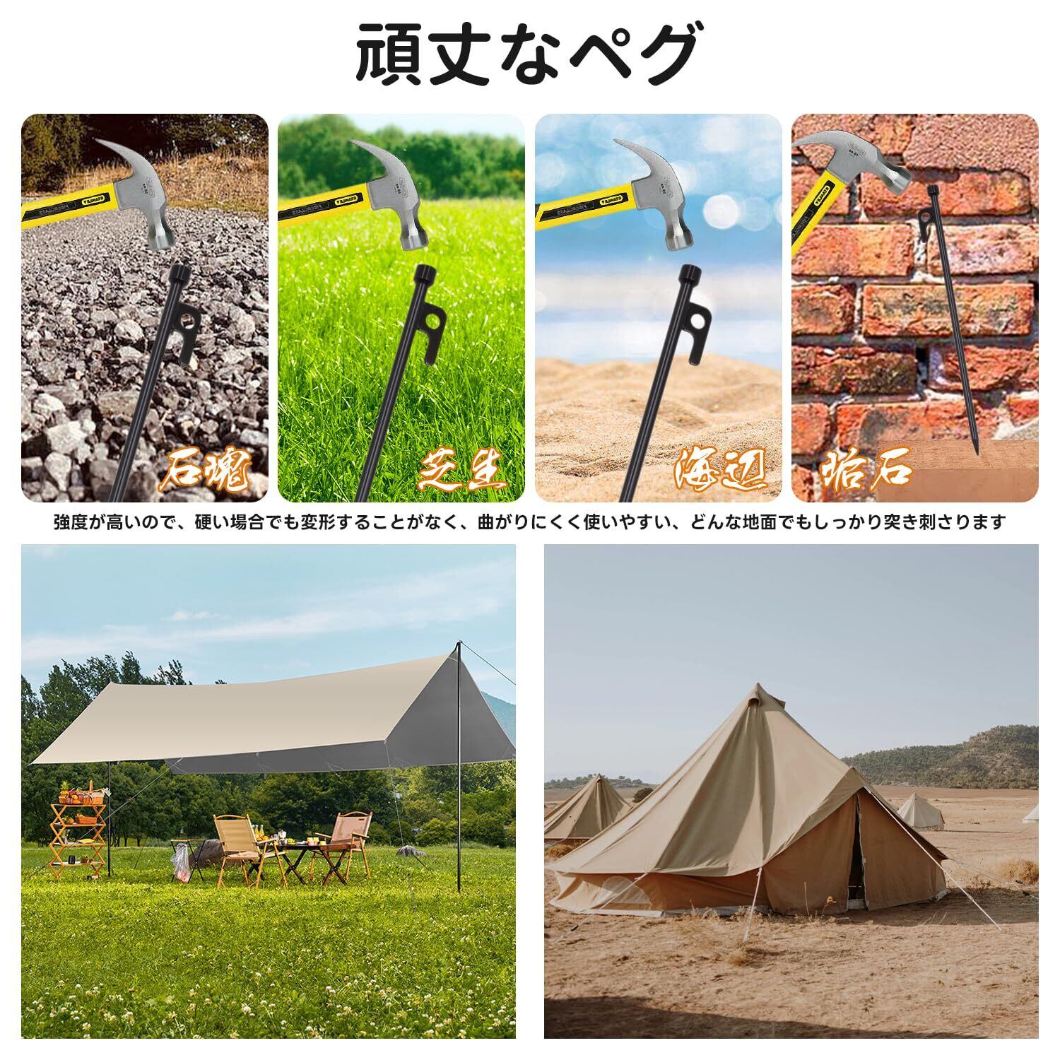 【幅広く応用】テントやタープ設営の際に役立つ。スチールペグは芝生などの柔らかい地面は勿論、砂利や小石がある地面でも難なく打ち込めるところが魅力です。レジャー・キャンプ・登山など万能に使用できます。