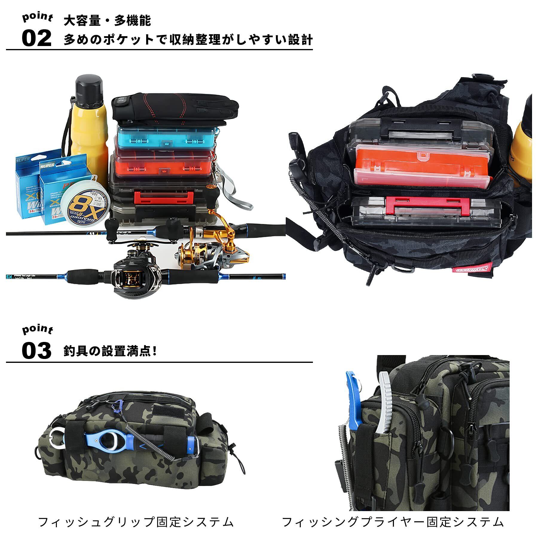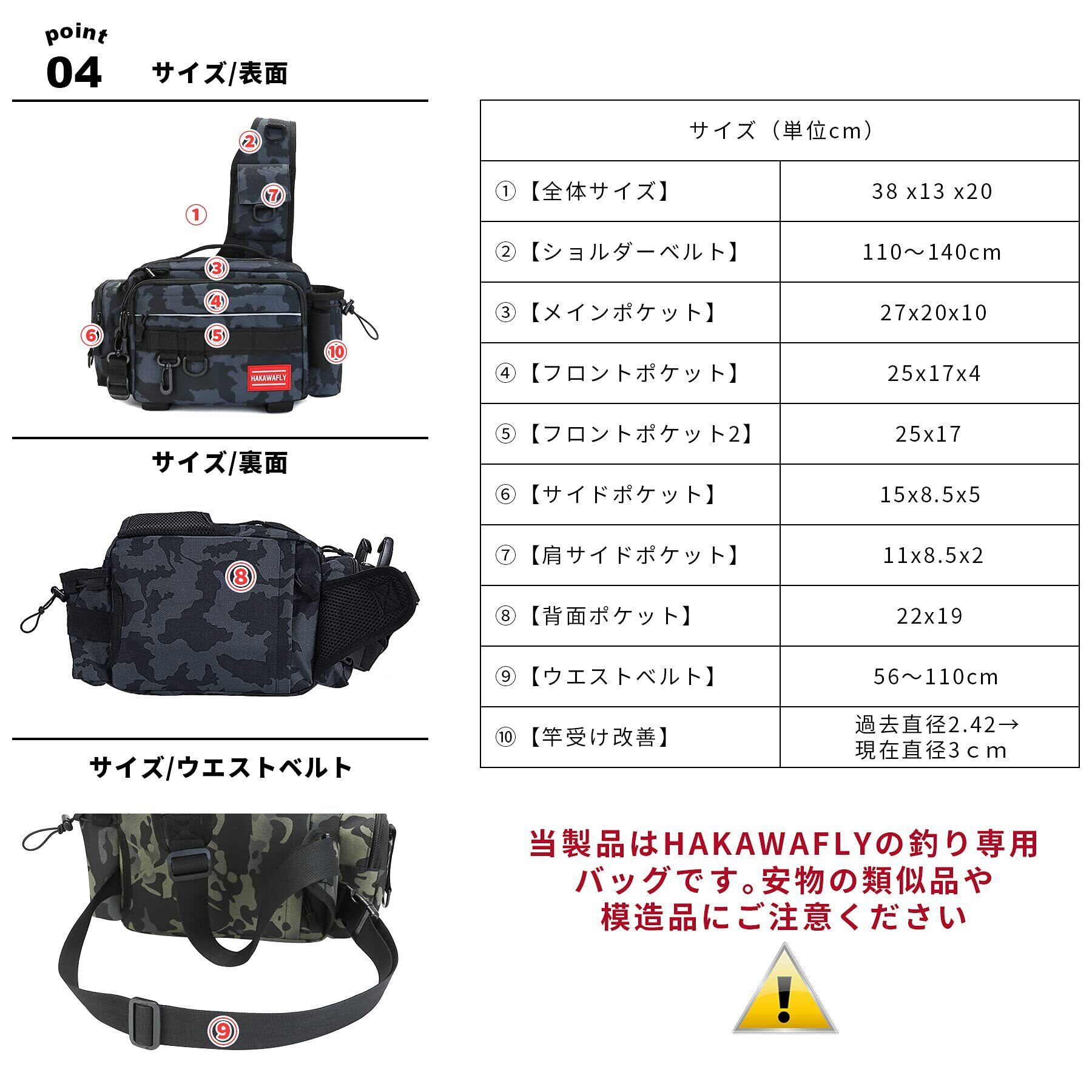 【重さ】620g【全体サイズ】幅38cm x 縦13cm x 高さ20cm 【メインポケット】27x20x10cm【フロントポケット×2】25x17x4cmと25x17cm【サイドポケット】15x8.5x5cm【肩サイドポケット】11x8.5x2cm【背面ポケット】22x19cm【背面隠しポケット】14x19cm【カップポケット】直径8cm 【大容量】:メインポケットには中型ボックス(24x12cm程度)が2、3個程度収納可能ポケットが多く設計タックルバッグ。背中に隠しファスナーポケットがあり、貴重品など入れることができます。ペットボトル、ペンチ、プライヤー、フィッシュグリップを収納する嬉しい専用ポケット。フィッシング専用バッグは多数のポケットを装備しみんなさんの快適な釣りをサポート。ショルダーベルトは110~140cmまで延長でき、ウエストベルトは56~110cmまで調節できます釣りカバン。