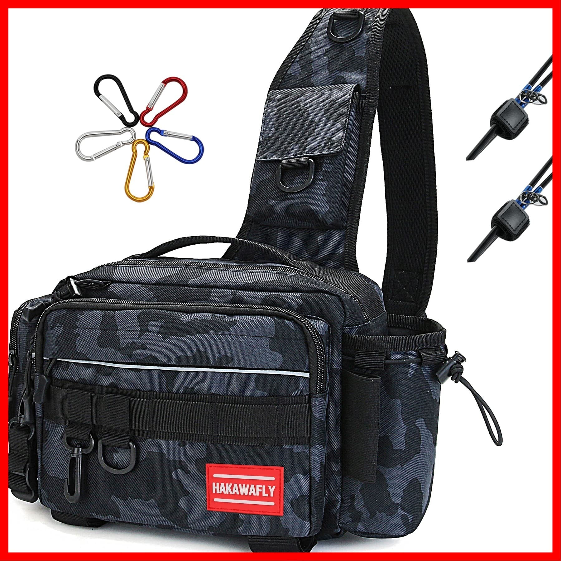 【2022最新】HAKAWAFLY フィッシングバッグ5WAY ロッドベルト2点とカラビナ5点付き 釣りバッグ 防水 タックルバッグ 多機能 大容量 ランガンバッグ (ブラック、カーキ迷彩、ネイビー迷彩) | カウカウ物販
