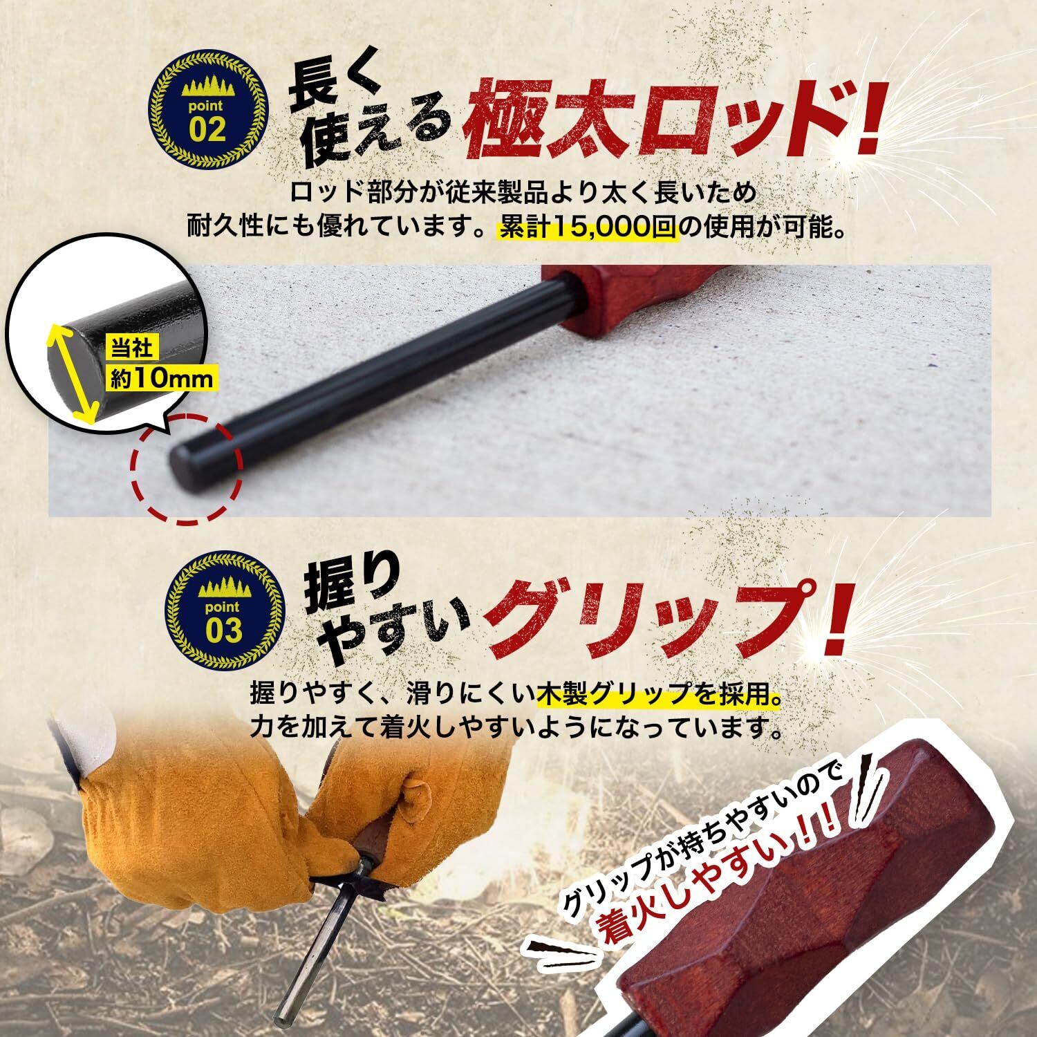 【握りやすい木製グリップ】握りやすく滑りにくい木製グリップを採用することで力を加えやすくなり、着火しやすいようになっています。
