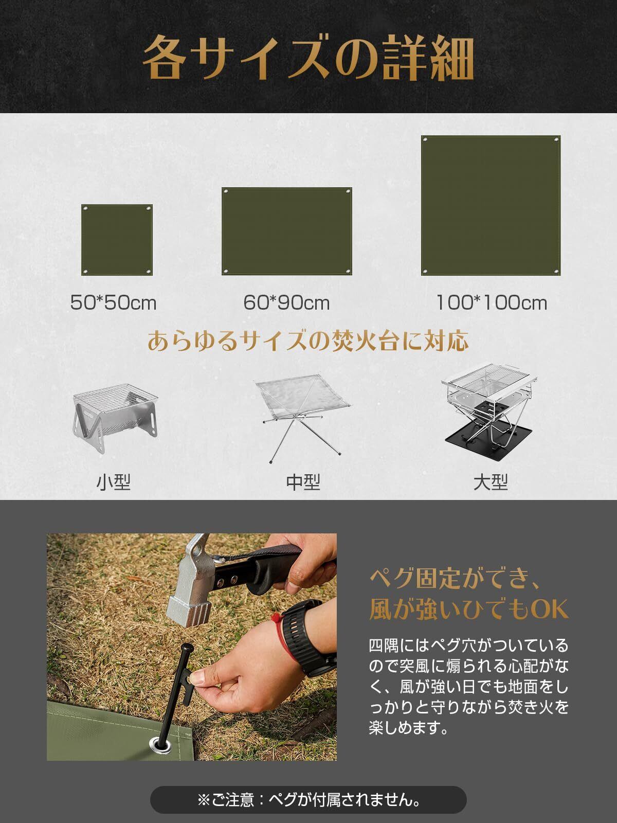 【様々なサイズの焚き火台に対応】 wolfyok outdoors焚き火シートには、50 x 50 cm、60 x 90 cm、100 x 100 cmの 3 つのサイズがあります。ほとんどのキャンプ用焚火台やバーベキューコンロに対応できます。友達と一緒にキャンプに行きましょう!焚き火シート、スパッタシート、焚き火台シート、耐熱シート、耐火シート、焚火シート、薪シートなどのベースシートとして使用でき、用途に合わせてサイズをお選びいただけます。