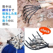 熊手は網付きで採取した貝などを洗うのに便利です。バケツは伸縮式で不使用時は専用袋にコンパクトに収納できます。