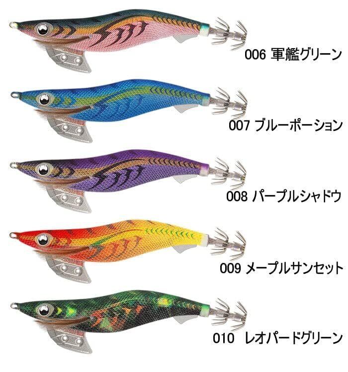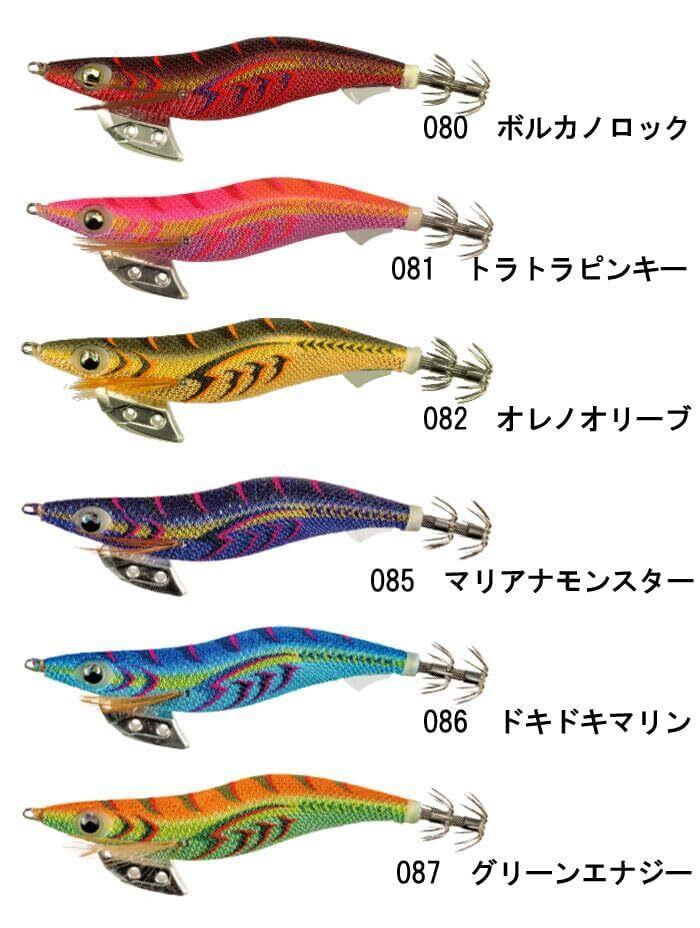 【086 ドキドキマリン】…日中の澄潮で活躍する青ボディに潮馴染みを意識した配色。青い光の反射が広範囲のイカに存在を認識させ、ピンクの差し色で艶めかしくアピールする。