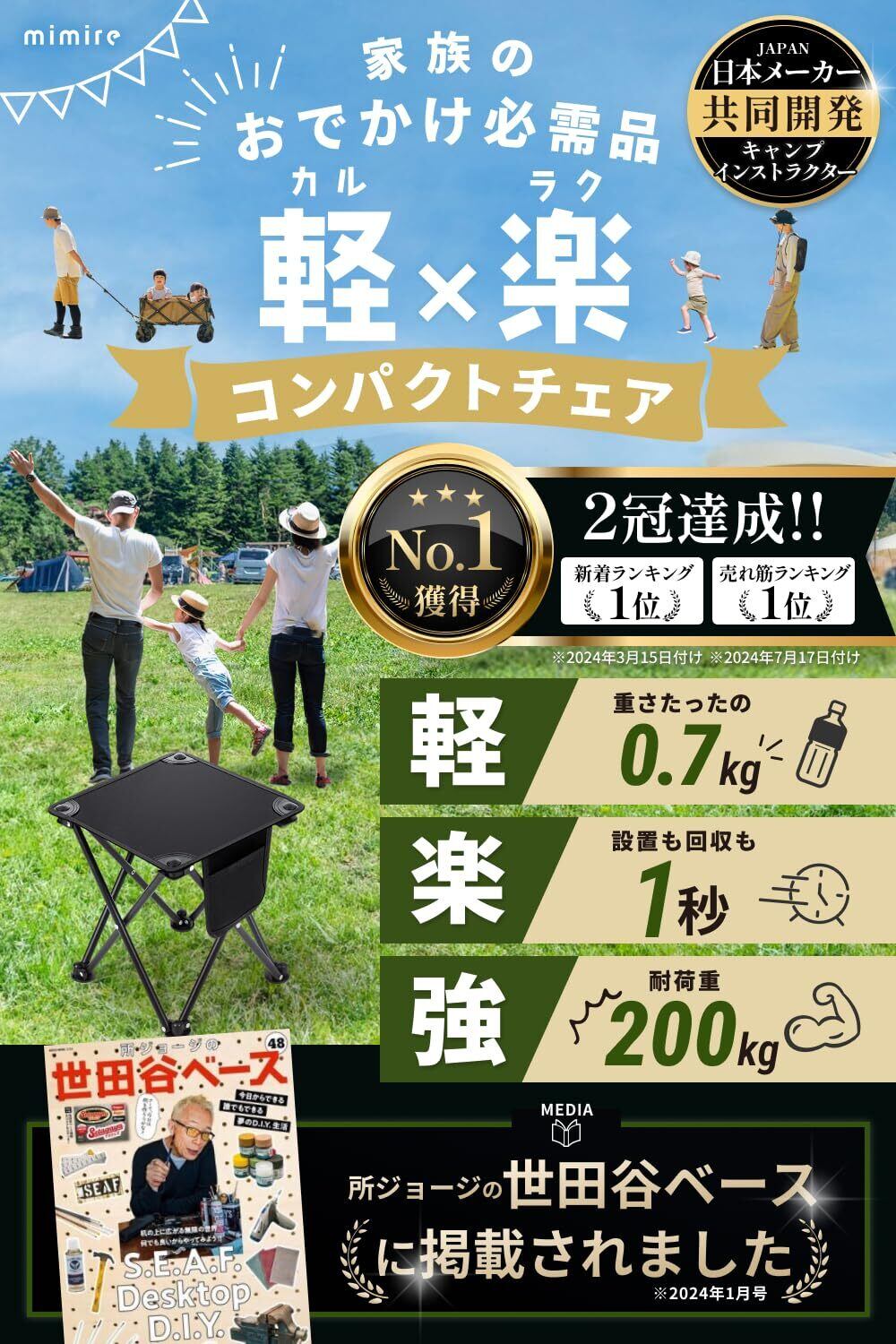 【超コンパクト使用シーン無限大】イス脚部の特殊ヒンジにより、使用後はコンパクトに折畳が可能です。また、専用のオックスフォード生地の収納袋にしまうことで、どこへでもすぐに持ち運びが可能です。キャンプ・BBQ・釣り・花火大会・テーマパーク待ち時間・大阪万博・ピクニック・花見・子供の試合観戦など様々なシーンでご使用いただけ、車に一台置いておけばどこでも安心なアウトドアアイテムです。