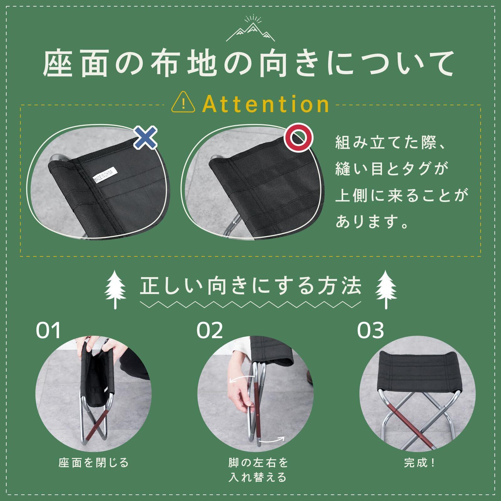 【座面の布地の向きについて】組み立てた際、縫い目とタグが上側に来ることがあります。《正しい向きにする方法》①座面を閉じる ②椅子の脚部分になる棒の左右を入れ替える ③完成! 座面の表裏逆になることについて、本商品ページ内に動画で直し方を説明しておりますので、参考動画をご覧ください。