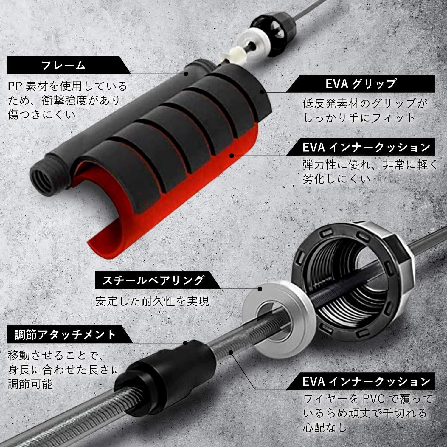 【商品PR】ハンドル内にベアリングを搭載してありロープが絡まらない構造になっており高速回転もスムーズでロープの長さ調整も可能で大人や子供でも最適な長さに調整してご愛用いただけます。 グリップ下のキャップを回しフタを外していただきロープを止めてある留め具を調整すれば長さが調整できます。