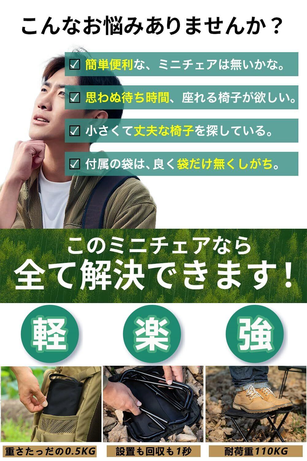 【収納ケースと一体になる】】収納ケースと一体型タイプの折りたたみチェアです。座面自体が収納袋に変身できるの設計で、片付けも瞬時で終わる。フレーム部分を引っ張って折りたたむだけで座面の裏面に収納でき、スペースがとれなく、収納袋紛失の心配もいりません。