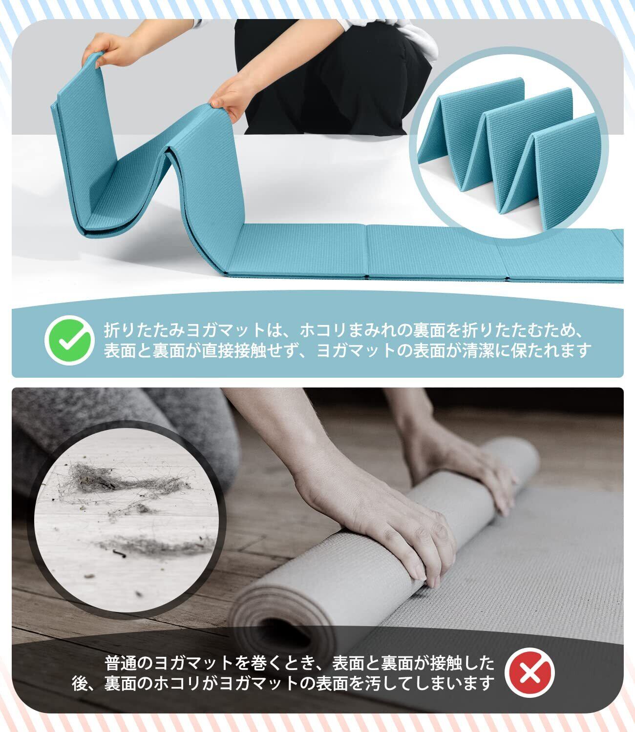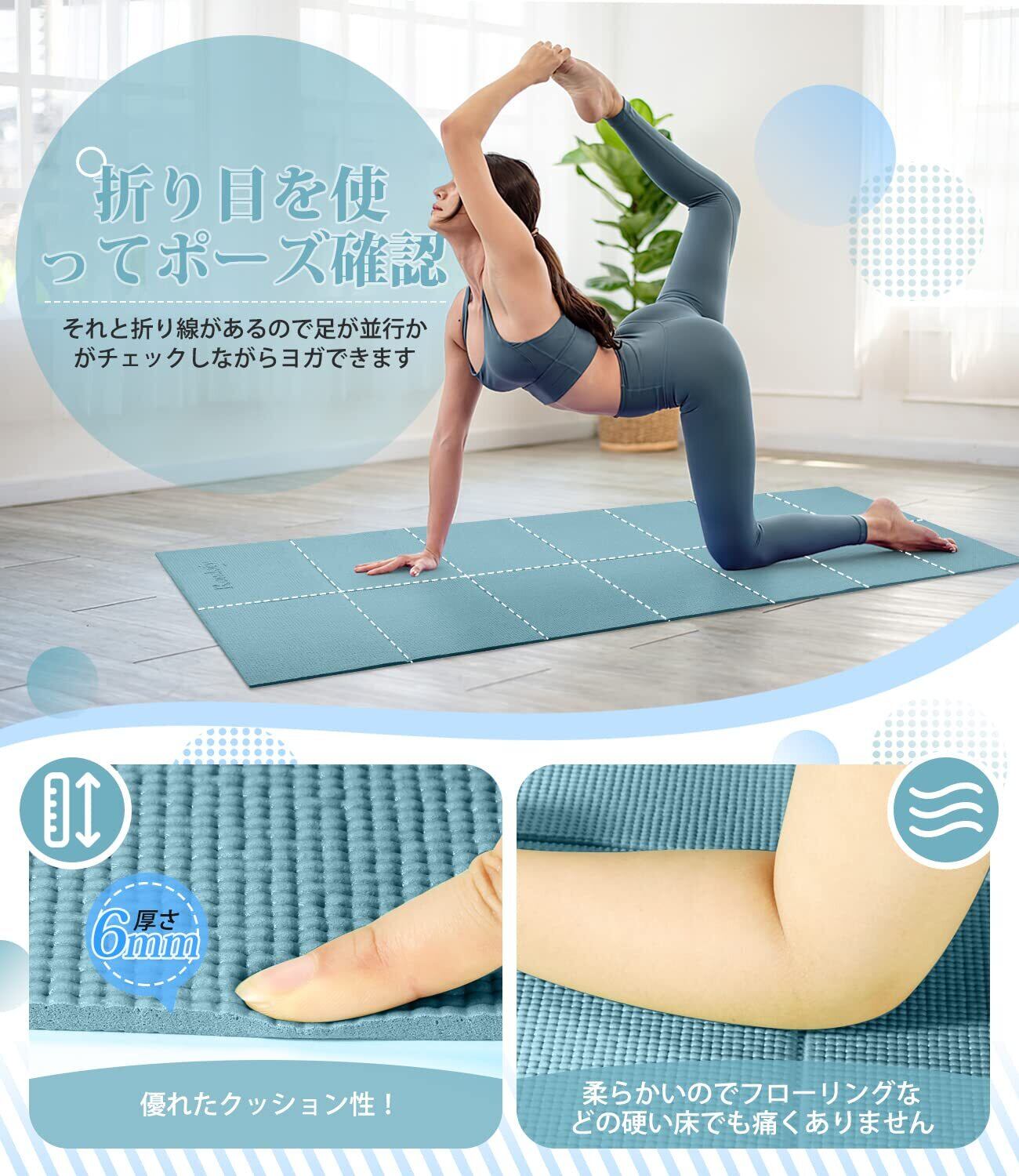 【収納しやすい】この折りたたみ式ヨガマットは、素早くコンパクトに収納できるように設計されています。通常のヨガマットは丸めて袋に入れなければなりません。収納にスペースを取られますし、時間もかかります。折りたたみ式ならシンプルな折りたたみのみで最もシンプルなデザインを実現させます。折りたたむと非常にコンパクトになるので、部屋のどこにもサッと置けるのでディリーユースにぴったりです。また、ヨガマットに折り目をつけると、ヨガやエクササイズの際にポーズや体が平行になっているかどうかを簡単に確認できますので、コアトレーニングにぴったりです!